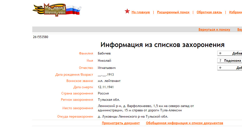 Валерий, а это ваш земляк, похороненный в Луковицах Информация из донесения о безвозвратных потерях Фамилия Бабичев Имя Николай Отчество Игнатьевич Дата рождения/Возраст __.__.1913 Место рождения Саратовская обл. Дата и место призыва Саратовский ОВК, Саратовская обл. Последнее место службы 258 сд Воинское звание мл. лейтенант Причина выбытия убит Дата выбытия 12.11.1941 | ||||
