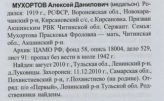 Информация из Книги Памяти Фамилия Мухортов Имя Алексей Отчество Данилович Дата рождения/Возраст __.__.1919 Дата выбытия __.07.1942 Название источника информации Имена из солдатских медальонов. Том 6 Информация из Книги Памяти Фамилия МУХОРТОВ Имя Алексей Отчество Данилович Дата рождения/Возраст __.__.1919 Дата выбытия __.07.1942 Название источника информации Книга памяти. Самарская область. Том 8 Информация из документов, уточняющих потери Фамилия Мухортов Имя Алексей Отчество Данилович Дата рождения/Возраст __.__.1919 Место рождения Воронежская обл., Новокарачанский р-н, с. Керсановка Дата и место призыва __.__.1940 Акшинский РВК, Читинская обл., Акшинский р-н Причина выбытия пропал без вести Дата выбытия __.07.1942 Название источника информации ЦАМО Номер фонда источника информации 58 Номер описи источника информации 18004 Номер дела источника информации 529 | ||||