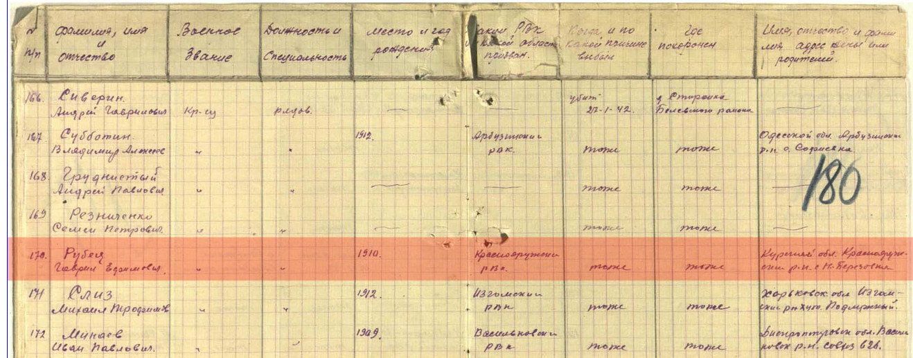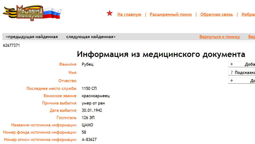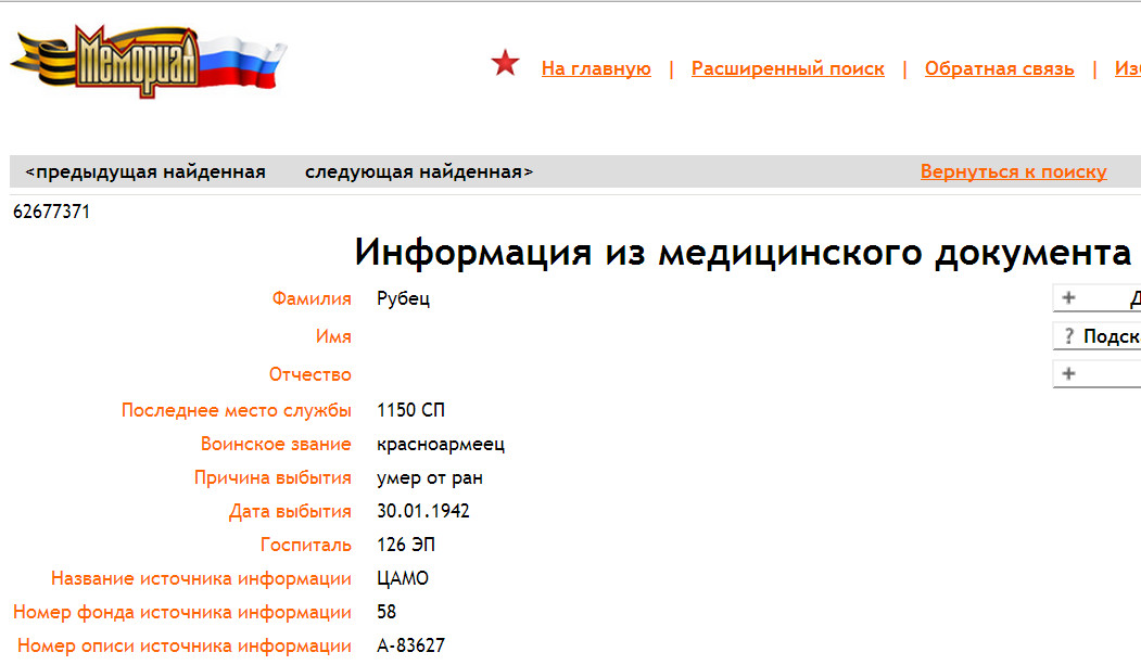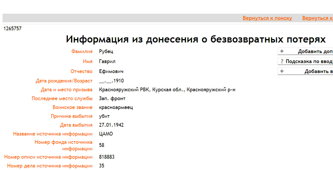 Переходим к человеку из Белевского района. Рубец Гаврил Ефимович умер от ран в те же примерно дни, но в Белевском районе. Прикрепленные файлы: