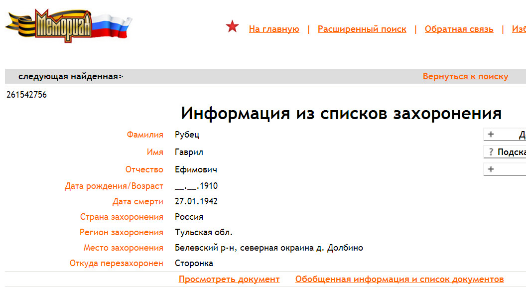 Куренков Виктор Иванович: А это еще один из электронной книги памяти Тульской области РУБЕЦ Н. М., русский, кр-армеец, пропал б/в. Виктор Иванович, а я в электронной книге памяти в общем списке захороненных в Тульской области нашла только двух Рубцов: РУБЕЦ, 30 янваpя 1942 г. умер от ран и зах.: Тульская обл., Плавский р-н, ст. Горбачево, мог. 3. Рубец Гаврил Ефимович, род.: 1910 г., Белгородская обл., Ракитянский р-н, рядовой, 1150 СП 342 СД, 27 января 1942 г. погиб и зах.: Тульская обл., Белевский р-н, д. Сторонка, перезах.: д. Долбино, южн. окр., м-36. А Рубец Н. М. находится в разделе родившихся или призванных в Тульской области. Редактировалось: 1 раз (Последний: 10 апреля 2014 в 02:03) | ||||