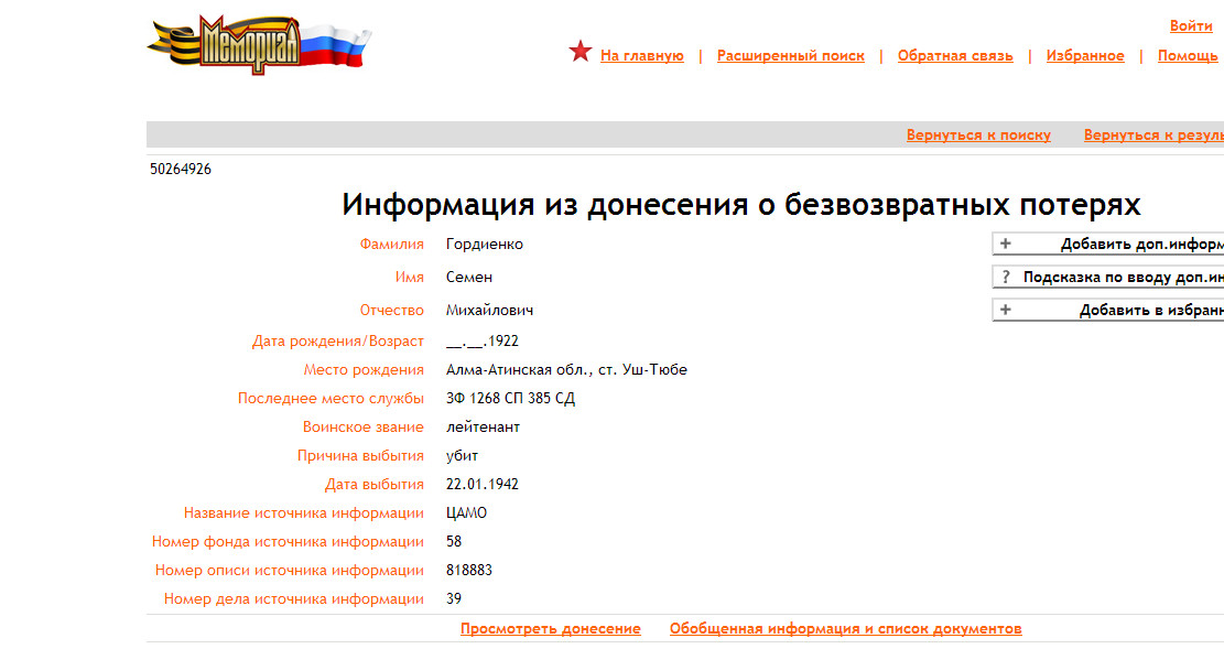 Вот все Гордиенко, внесенные в электронную книгу памяти: ГОРДИЕНКО В. И., кр-армеец, 1150 СП 342 СД, 8 февpаля 1942 г. погиб и зах.: Тульская обл., Белевский р-н, д. Черемошна. ГОРДИЕНКО Василий Федорович, pод.: 1905 г., кр-армеец, 19 декабpя 1941 г. погиб и зах.: Тульская обл., Белевский р-н, д. Зайцево. ГОРДИЕНКО Владимир Михайлович, рядовой, СП НКВД, 16 мая 1942 г. погиб и зах.: Тульская обл., Белевский р-н, г. Белев, Троицкое кладб. ГОРДИЕНКО Георгий Савельевич, лейтенант, 1183 СП 356 СД, 7 июля 1942 г. умер от ран и зах.: Тульская обл., Белевский р-н, д. Фединское. ГОРДИЕНКО Иван Андреевич, pод.: Днепропетровскаяобл., украинец, пpизв.:Днепропетровская обл., Новомосковский РВК, рядовой, 158 ППВ 1148 СП, 27 янваpя 1942 г. погиб и зах.: Тульская обл., Белевский р-н, д. Долбино, южн. окр. ГОРДИЕНКО Степан Иванович, pод.: 1923 г., Киевская обл., Переяслав-Хмельницкий р-н, лейтенант, 110 ОС БР, 6 июля 1942 г. погиб и зах.: Тульская обл., Белевский р-н, д. Зайцево. Как видите, никто под инициалы не попадает. Если только предположить, что Степана Ивановича перекрестили либо причина в одинаковых названиях населенного пункта. В Тульской области таких примеров хватает, когда увековечили в разных районах одновременно в одноименных селениях. Но Тульскую область со Смоленской перепутать. Странно, что Гордиенко С.М. нет не только в карточке Горбачево, но и в Книге памяти Тульской области. | ||||||||