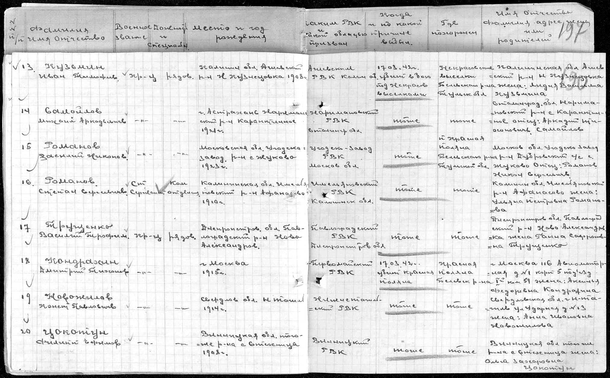 Куренков Виктор Иванович: Ирина просит устновить истинную могилу дяди. Мы можем только предоставить все имеющиеся сведения из донесения, книги памяти и учетной карточки. Можем попытаться выяснить, где находились Некрасовские Выселки и было ли оттуда перезахоронение в Кочерово. Но наш заявитель должен понимать, что всё это лишь предположения, поскольку никто уже не ответит на вопрос, было ли перезахоронение по факту либо только на бумаге фамилии бойцов увековечили в разных местах. | ||||||||