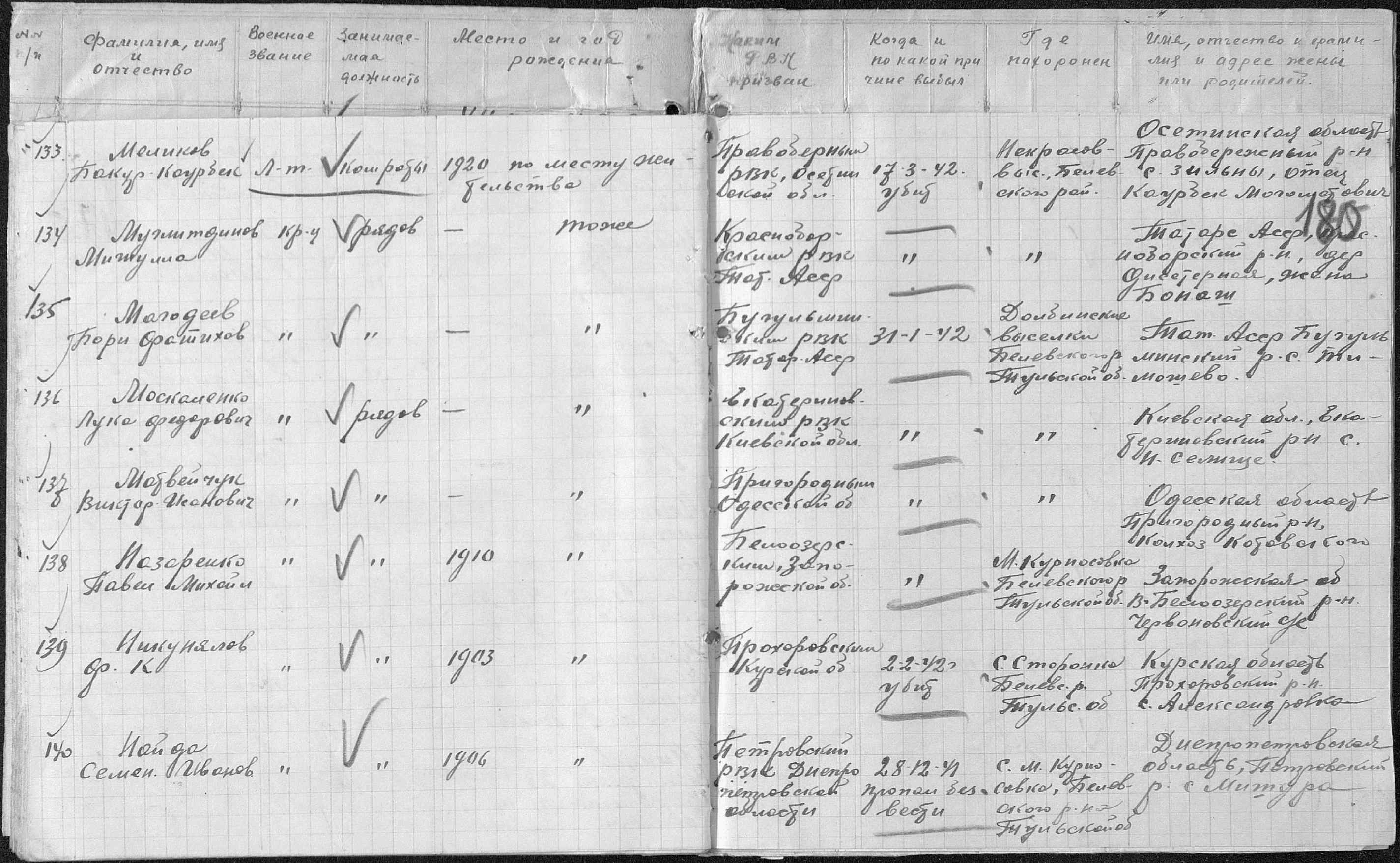 Уважаемая Ирина! Для начала давайте выложим здесь для пользователей сайта те документы, которы есть на ОБд по вашему дяде, чтобы всем было понятно, о чем вы пишите: Информация из приказа об исключении из списков Фамилия Меликов Имя Бакур Отчество Каурбек Дата рождения/Возраст __.__.1920 Последнее место службы 342 СД 1148 СП Воинское звание лейтенант Причина выбытия погиб Дата выбытия 17.03.1942 Название источника информации ЦАМО Номер фонда источника информации 56 Номер описи источника информации 12220 Номер дела источника информации 28 Информация из донесения о безвозвратных потерях Фамилия Меликов Имя Бакур Отчество Каурбек Дата рождения/Возраст __.__.1920 Место рождения Осетинская обл., Правобережный р-н, с. Зильны Дата и место призыва Правобережный РВК, Северо-Осетинская АССР, Правобережный р-н Последнее место службы 61 Арм. 1148 СП Воинское звание лейтенант Причина выбытия убит Дата выбытия 17.03.1942 Название источника информации ЦАМО Номер фонда источника информации 58 Номер описи источника информации 818883 Номер дела источника информации 1076 Похоронен Некрасовские Выселки Белевского района. Информация из донесения о безвозвратных потерях Фамилия Меликов Имя Бакур Отчество Каурбекович Дата рождения/Возраст __.__.1920 Последнее место службы в/ч п/п 15367 Воинское звание лейтенант Причина выбытия убит Дата выбытия 17.03.1942 Название источника информации ЦАМО Номер фонда источника информации 58 Номер описи источника информации 977525 Номер дела источника информации 269 Убит Некрасовские Выселки Высланное извещение № 316. Информация из списков захоронения Фамилия Меликов Имя Бакур Отчество Каубекович Дата рождения/Возраст __.__.1920 Воинское звание лейтенант Дата смерти 17.03.1942 Страна захоронения Россия Регион захоронения Тульская обл. Место захоронения Белевский р-н, д. Кочерово Информация из Книги Памяти Фамилия МЕЛИКОВ Имя Бакур Отчество Каурбекович Дата рождения/Возраст __.__.1920 Дата выбытия 17.03.1942 Название источника информации Книга памяти. Тульская область. Том 12 Захоронен в Кочерово. 121 ГСД. Прикрепленные файлы: