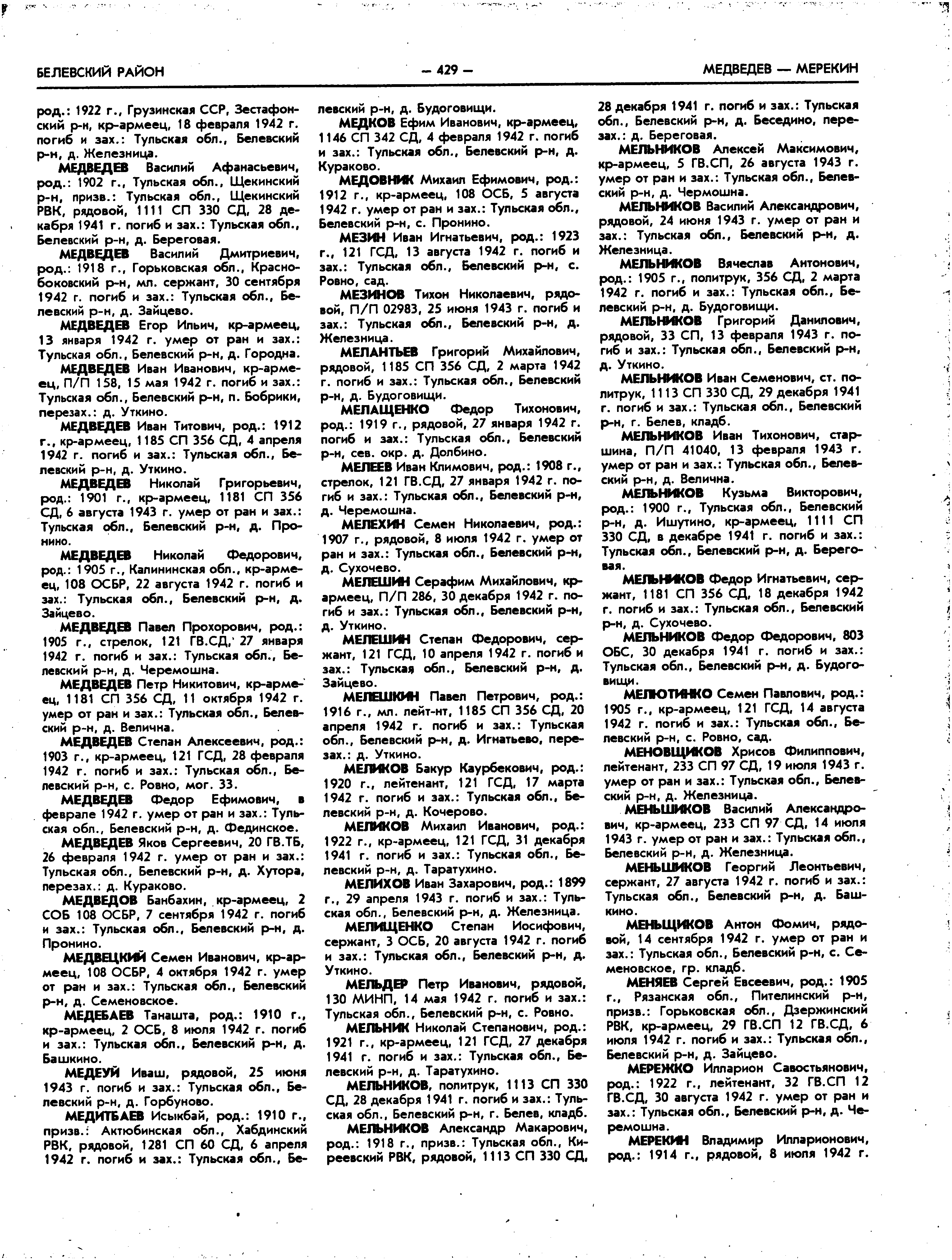 Куренков Виктор Иванович: Он в учетной карточке именного захоронения д. Кочерово. В учетной карточке нет отметки, откуда он перезахоронен. 1. Он был командиром роты. Надо искать, где погибли 17.03.1942г. из этой роты 1148 СП 342 СД. 2. Некрасовские выселки или Кочерово? Что ещё нужно искать, если в донесении чётко указано - Некрасовские Выселки? Помимо Меликова, там ещё 5 человек. Также в донесениях в этот день упоминаются Красная Поляна и Сторонка. Другой вопрос, откуда в извещении взялся другой населенный пункт. И ещё один момент- было ли в Кочерово перезахоронение из Выселок. Сейчас среди населенных пунктов Белёвского района нет Некрасовских Выселок. Возможно, довоенная карта в чём-то поможет разобраться. А вот если бы ещё белевские поисковики к этому подключились... Пока на моё сообщение один из них не ответил. Пока бегло просмотрела. Из Сторонки и Красной Поляны есть перезахоронение в Долбино. А вот из Некрасовских Выселок: Информация из списков захоронения Фамилия Дмитриев Имя Николай Отчество Николаевич Воинское звание рядовой Дата смерти 17.03.1942 Страна захоронения Россия Регион захоронения Тульская обл. Место захоронения Белевский р-н, остров реки Рукав, около д. Смычка, д. Ретюнь Первоначально захоронен в Некрасовских Выселках. В карточке не указано, что перезахоронен из Некрасовских Выселок. Так что, дорогие коллеги, найти логику в послевоенном переносе найти трудно. Редактировалось: 1 раз (Последний: 13 апреля 2014 в 12:25) | ||||||||