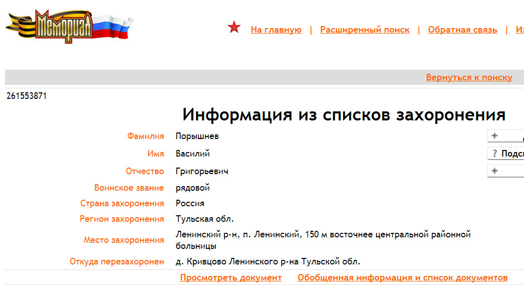А вот здесь он даже перезахоронен из Кривцово в Ленинский. Прикрепленные файлы: