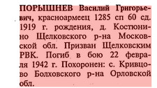 Если вернуться к самому началу темы, то Порышнева никуда не перезахоронили. Он так и остался в Кривцово Болховского района. Но, как это ни парадоксально, увековечен он в Тульской области. Хотя, судя по Книге памяти региона призыва (Московской области) в извещении родственникам всё правильно написали: Болховский район. Пишу это для того, чтобы систематизировать тему. В одной теме - один боец. Редактировалось: 1 раз (Последний: 15 апреля 2014 в 13:01) | ||||||||