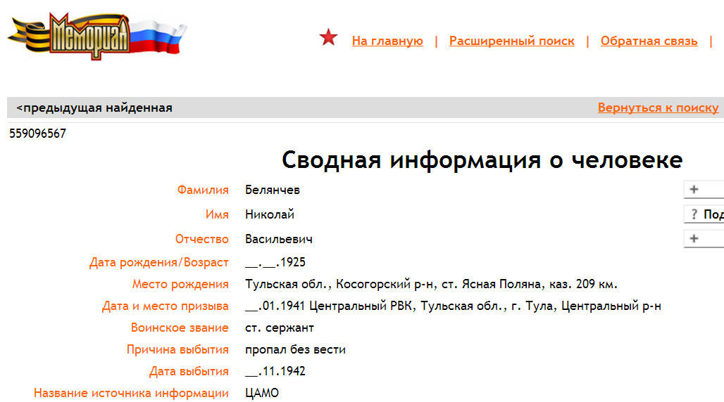 Валерий Попов: В данном случае запрос может сделать только родственник.Татьяна Вотинцева: Это да. Я такие вещи принципиально не делаю. Человек должен приложить сам какие то усилия. Правда она присылала фото. Но как то так. Пусть пишет.Думаю, заполнить анкету, приложить скан донесения и отправить по указанному в анкете адресу она и сама сможет. | ||||||||||