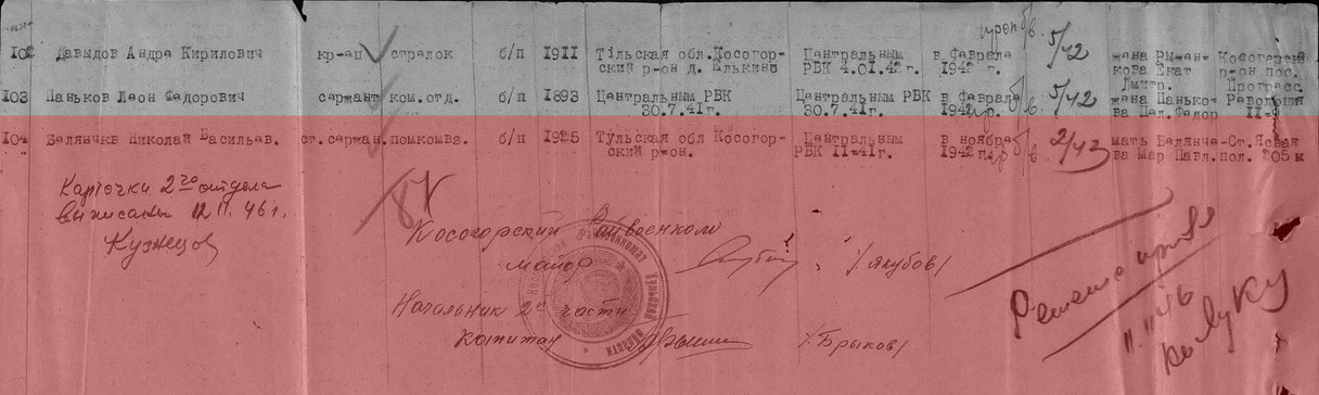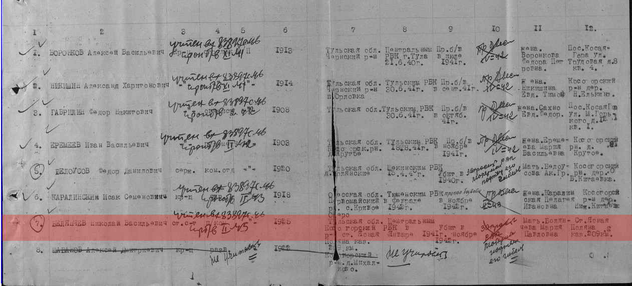 Коллеги. То что мы расследовали до этого это другой Белянчев видимо. Вот какое письмо я получил сегодня. Здравствуйте, Валерий! Сегодня прочитала Ваше письмо о Белянчеве Николае , посмотрела сводную ведомость призывников и убедилась в том, что это не мой дядька. Хочу уточнить некоторые детали. Белянчев Николай Васильевич. Дата рождения : декабрь (≈19-21 число) 1924 года. В мае 1941 г. только окончил 10-й класс, учился на «отлично». На фронт забрали сразу после того, как с Ясной Поляны прогнали немцев. Мама рассказывает, что у них в доме был немецкий штаб. Их семью выгнали , и они жили в землянке. Был случай, как немецкие «Стедебеккеры» (крытые машины) обокрали, немцы на следующее утро собрали всю молодежь и многих из них угнали ( говорили, в Германию на работы), их больше никто не видел. Мать Николая и моей мамы Лукерью Максимовну предупредил немец-водитель машины: «Матка, пусть сын уйдет». Николай на две недели ушел через лес в другую деревню к родным. А когда наши стали наступать, уже из- под железной дороги, снизу, от леса, показались наши танки, в штабе по последнего сидел немец-радист. Потом он вскочил на мотоцикл и уехал. Вскоре после этого Николая забрали на фронт. Адрес дома в письме с фронта: г.Тула, п/о Косая Гора, Толстовские дачи, д. 13. Адрес отправителя: полевая почта 81045 Дата последнего письма : 14.12.1944 Последние (видимые) цифры на конверте около штемпеля 0645 Мать Николая звали Лукерья Максимовна Белянчева (урожд. Кузьмичева) Отец – Василий Дмитриевич Белянчев ( родом из д. Деменки) Прилагаю фото Николая и его письма с фронта. 1. На фото из госпиталя с оборотной стороны надпись простым карандашом: 15 1 44 (вероятно, дата) ниже : Н. Белянчев После госпиталя обучался в Гороховецких лагерях на танкиста. 2. На фото в танкистском шлеме на оборотной стороне была надпись, потом фото было приклеено на какую-то основу-открытку, сейчас понять уже ничего нельзя. В похоронке (ее у нас нет) было указано место захоронения ≈ Варшавское шоссе. Спасибо Вам. С уважением, Валерий Попов | ||||||||||