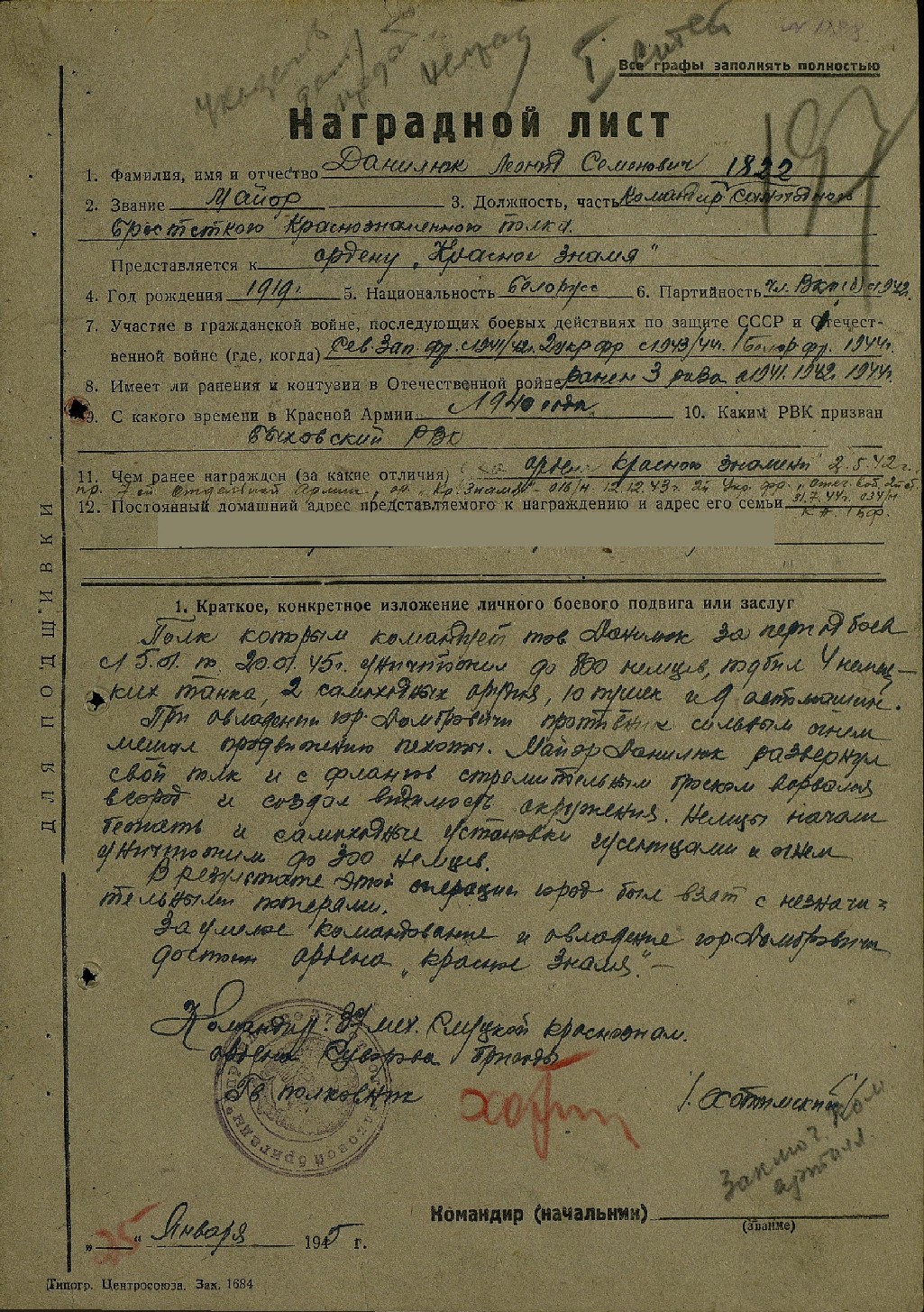 Наградной лист на командира полка Данилюка Леонида Семеновича от 25 января 1945 года. В январе 1945 года полк взял польский город Домбровичи. Польша подтверждается. | ||||||||||