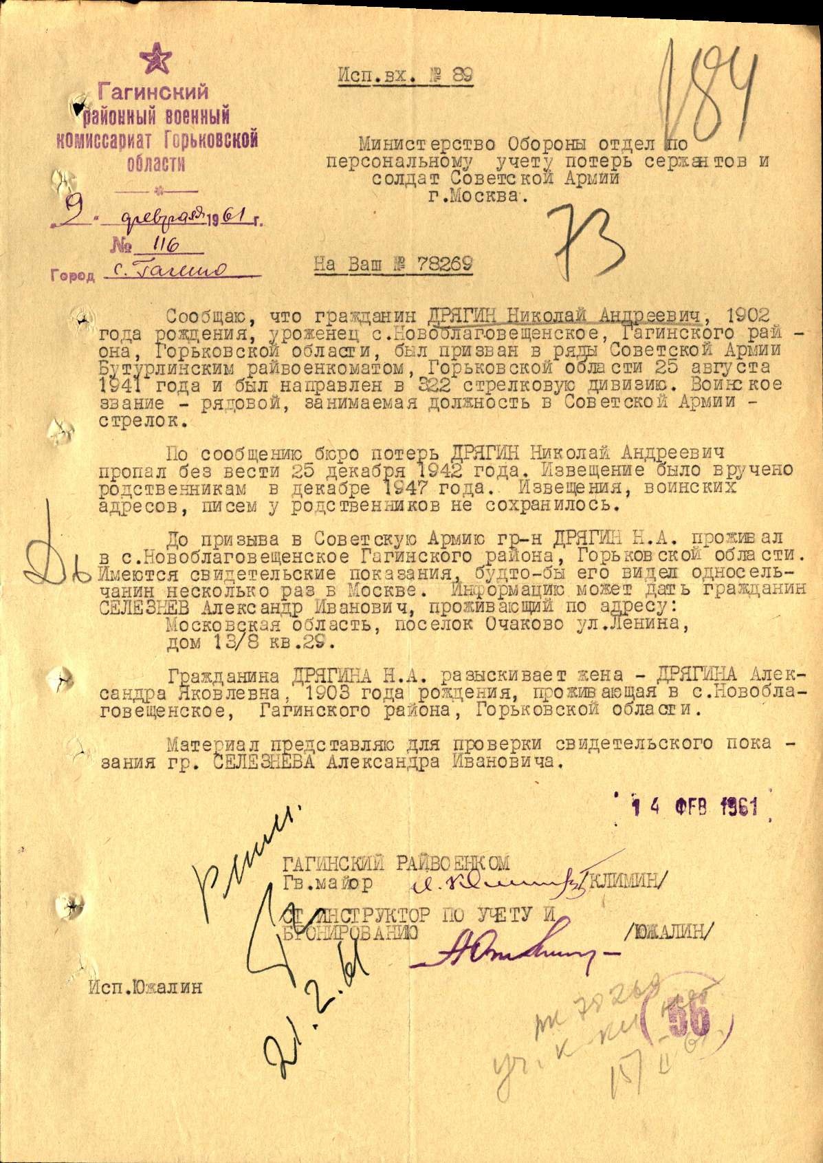 Сергей Шабров: Уважаемый Сергей! Вы прикрепили 2 лист документа, а есть ещё первый:Здравствуйте. Друзья, помогите узнать место гибели или возможное место захоронения Дрягина Михаила Андреевича 1902 г. р. Был призван Бутурлинским райвоенкоматом Горьковской области 25 августа 1941 года. Проходил службу в 322 стрелковой дивизии, 1089 стрелковый полк. Пропал без вести 25 декабря 1942 года. Не могу найти, в каких боях, где именно воевала 322 с.д. 25 декабря 1942 года. Буду признателен за любую полезную информацию. В апреле 1942 года семья получила извещение о том, что Николай Андреевич пропал без вести 25 января 1942 года. Повторное извещение вручено в декабре 1947 года. Оно пришло из бюро потерь. Вот в нем уже указано 25 декабря 1942 года. Вы прикрепили материал проверки, который выслан отделом по учету потерь минобороны в Гагинский РВК 14 февраля 1961 года. Из него следует, что были свидетельские показания односельчанина о том, что Дрягина видели несколько раз в Москве. Я так понимаю, что речь идет о послевоенном времени? Свидетельские показания принадлежали Селезневу Александру Ивановичу. Получается, что получив 2 извещения с разными датами пропажи без вести в 1961 году семья ищет Дрягина, при этом есть свидетель, который якобы видел его в Москве. Сергей, вы в запросе пишете Михаил Андреевич, а в теме - Николай Андреевич. Где правильно? Прикрепленные файлы: