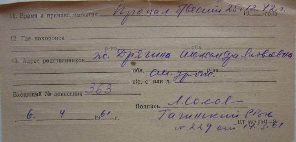 Валерий Попов: Карточка приведенная в посте № 5, она аж 1961 года. Искать Дрягина можно и в Тульской области. Валерий, в карточке 1961 года дублируются сведения извещения от 1947 года с 25 декабря 1942 года. Могли ошибиться как в случае с декабрем, так и в случае с январем 1942 года. Но, коллеги, вы все упустили из виду ещё один момент - свидетельские показания о том, что Дрягина видели в Москве после войны. Редактировалось: 1 раз (Последний: 23 апреля 2014 в 10:47) | ||||
