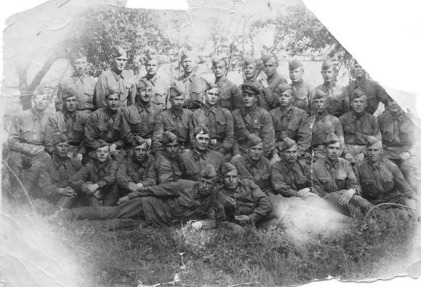 Надпись на обороте: «1941 год Узбекистан, г.Бухара курсанты артиллерийской школы, впереди на траве лежат слева - Черняев Пётр Ильич, справа - Кузнецов Евгений Иванович - преподаватели Ухоловского р-на Рязанской обл.