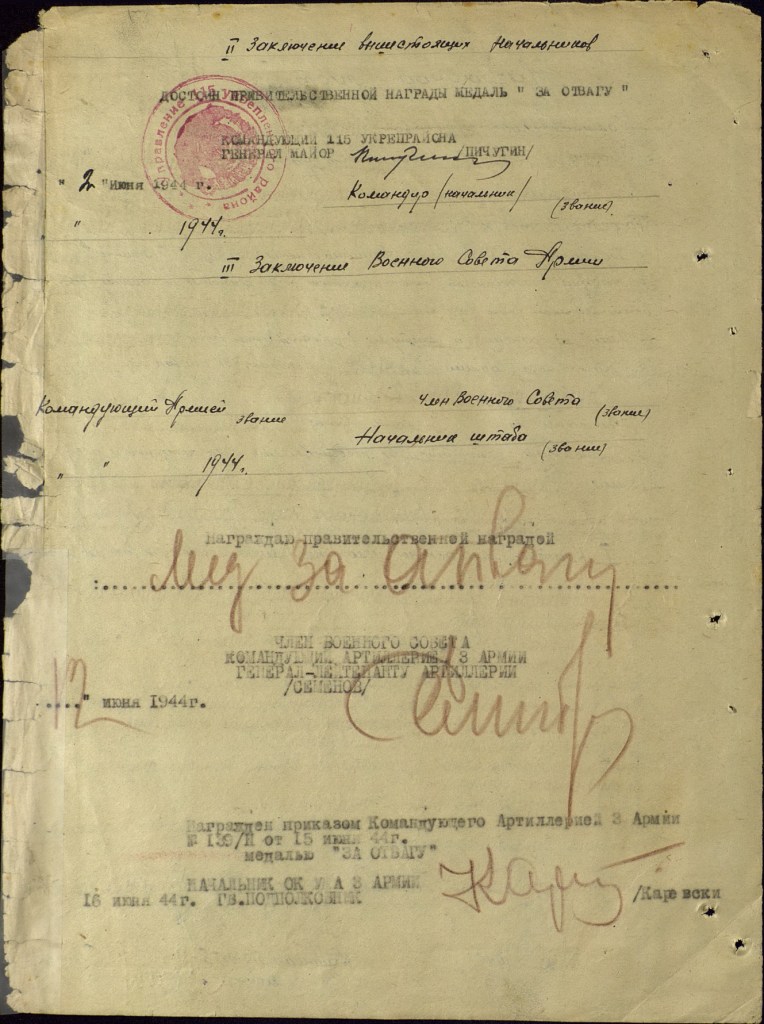 Уважаемые друзья, большое спасибо за помощь Мои соображения: 1.Фото п. #12 не ретушировано, на обороте имеется надпись «На память с фронта Нине и сынке Толе от Пети 30.10.42 (подпись)» Погон на данном снимке не могло быть, они введены в январе 1943 г. 2. Фото п.#28. Считали, что снимок сделан в 1944 году. Однако, поскольку на снимке петлицы, а не погоны, очень вероятно, что гораздо раньше. Если так, то не исключено, что на снимке - выпускники ПАУ. Но только если снимок сделан после выпуска. Маловероятно, что все они попали в одну часть. Скорее всего,это сослуживцы по 487 стрелковому полку и по 510 отд. пулеметно-артиллерийскому батальону ОПАБ) 115 укрепрайона. Сестры Петра Ильича (соответствевнно, мои тетки), уверенно узнали его на данном снимке (вверху, справа , а не внизу, слева, со слов моего покойного отца). 3.Удалось найти справку, что 16.09.42 П.И. Черняев служил в 487 с.п. (возможно, первое место службы по окончании ПАУ). 4. Сохранились также два письма и корешки к денежным .переводам. Данные такие: письма от 28.01.1944 и от 10.08.1944 - полевая почта 45891 «Д»; талоны к почтовым переводам: - в июле 1942 года - ДКА, 704 полевая почта, 487 с.п., батарея ПТО; - в августе 1942 года - 704 полевая почта, 487 стр.полк, батарея ПТО; - в сентябре 1942 года - 704 полевая почта, 487 стр.полк, батарея ПТО; -в октябре 1942 года - 704 полевая почта, часть 42. 5. Хотелось бы уточнить. Из наградных материалов Фото (п.#9), следует, что Петр Ильич в июне 1944 г. представлялся к ордену Красного Знамени, а был награжден медалью "За отвагу". Это была его первая и единственная награда? |