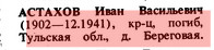 А у меня вопрос к заявителю лишь один: на основании чего вы утверждаете, что после войны был найден медальон? Запись о деревне Береговая есть только в Книге памяти Калужской области, следовательно, скорее всего, данные из извещения.В Книге памяти Тульской области Астахова нет. Редактировалось: 2 раз (Последний: 9 мая 2014 в 23:31) | ||||