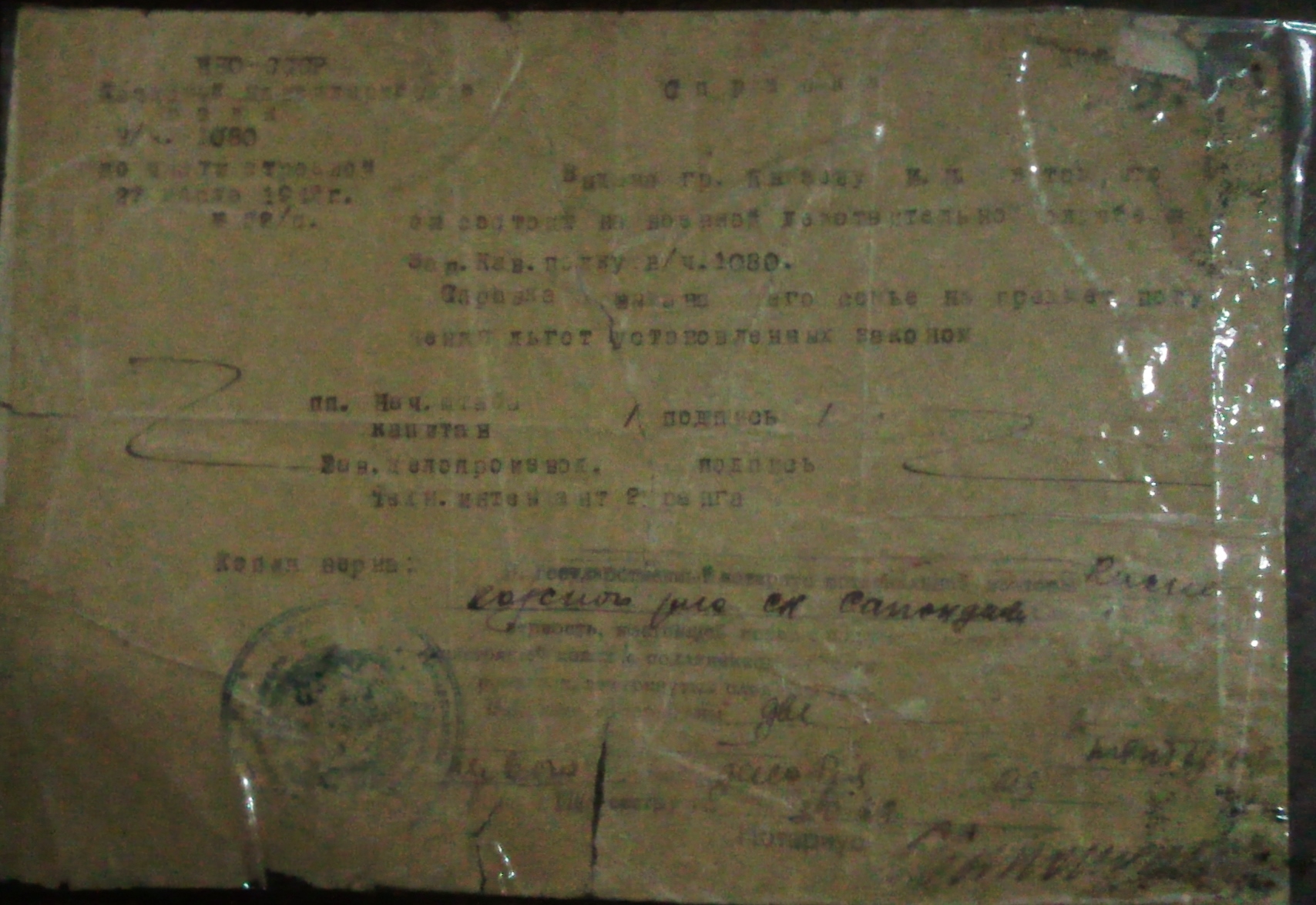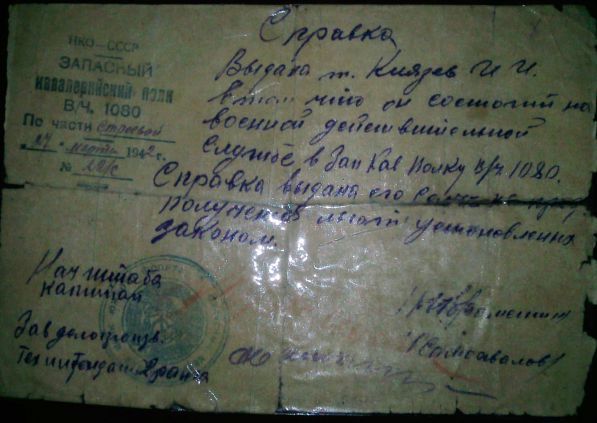 Всю известную мне информацию я черпаю из справки, которую бабушка всю жизнь хранила, а сейчас она находится у меня. Информация из данной справки: "Данная справка дана Князеву И.И. служащему в Запасном Кавалерийском полку Южного фронта В.Ч.№1080 по части строевой в Западно-кавалерийском полку, Начальник штаба капитан (фамилию прочитать трудно,скорее всего или Абранский или Абрамский) и зав.делопроизводитель тех. интендант 2 ранга Самохвалов.