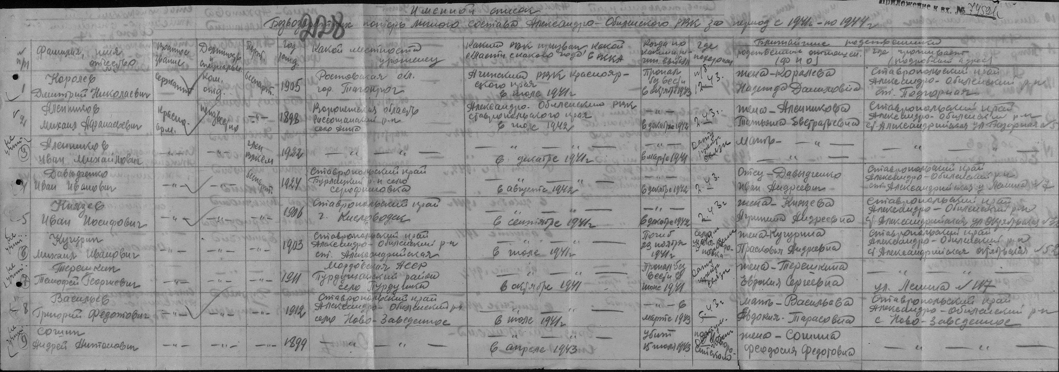 Добрый день! Пишет вам Гасанова Ирина Евгеньевна.Хочу найти какую-нибудь информацию о месте захоронения моего прадедушки Князева Ивана Иосифовича 1906 г.р! Всю жизнь моя бабушка мечтала найти хоть какую-нибудь информацию о нем. Прадедушка,Князев Иван Иосифович,родом из г.Кисловодска. Адрес проживания на момент призыва: Ставропольский край Алескандро-Обилейский р-н, станица Александрийская ул. Октябрьская. Название части Александро-Обильненский РВК Ставропольского края.