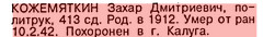 Информация из приказа об исключении из списков Фамилия Кожемяткин Имя Захар Отчество Дмитриевич Дата рождения/Возраст __.__.1912 Последнее место службы 413 СД Воинское звание политрук Причина выбытия умер от ран Дата выбытия 10.02.1942 Родственница Кожемяткина, ул. Краснофлотская д. 20 |