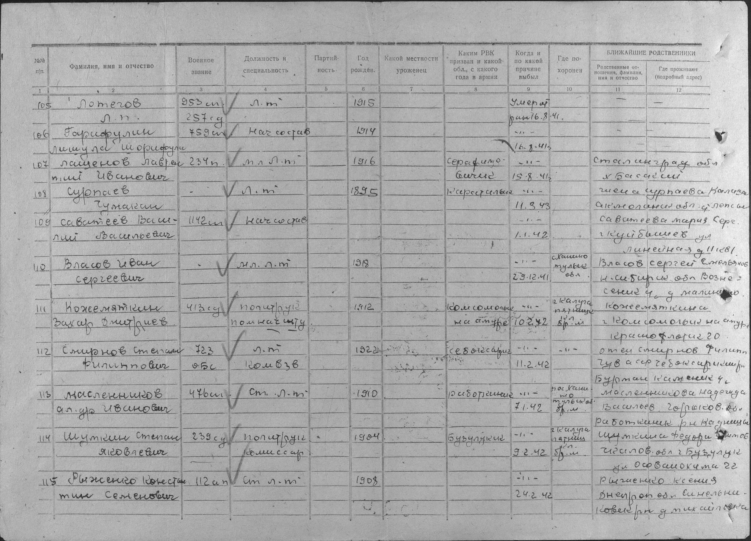 Сообщений: 1883 | Помогите установить судьбу моего деда Котеняткина Захара Дмитриевича 18.09.1912 г. р. место рождения не знаю. Воевал в413сд,которая была сформирована в г.Своодный,политруком в звании лейтенант. Призывался Комсомольским-на-Амуре РВК.К сожалению конверты с номерами в/ч не сохранились.В42году моя бабушка получила известие,что 10.02.42 дед умер от ран в госпитале и похоронен в братской могиле в г.Калуга. Обращалась в библиотеку имени Н.Островского в г.Комсомольске-на-Амуре на сайт Ищу человека,никакой информации не нашли.Искала информацию на сайте обд Мемориал,только в Книге Памяти Калужской области.Не может же человек исчезнуть,да еще и политработник. Буду благодарна вам за любую информацию. С уважением, Валерий Попов |