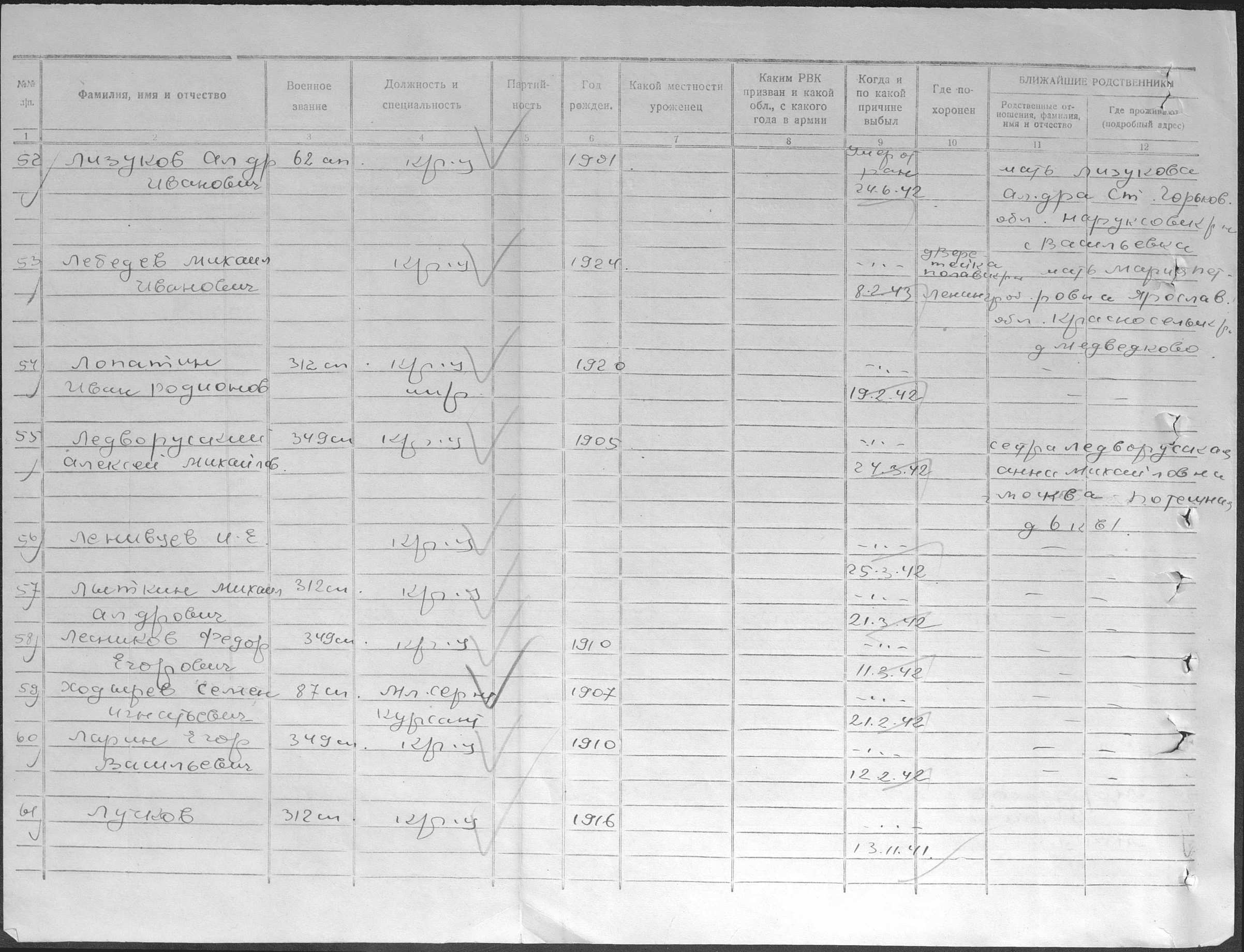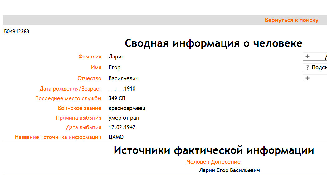 Информация из донесения о безвозвратных потерях Фамилия Ларин Имя Егор Отчество Васильевич Дата рождения/Возраст __.__.1910 Последнее место службы 26 СД Воинское звание красноармеец Причина выбытия умер от ран Дата выбытия 12.02.1942 Название источника информации ЦАМО Номер фонда источника информации 58 Номер описи источника информации 18003 Номер дела источника информации 1213 Захоронен: Ленинградская область, Д. Малый Заход. Информация из списков захоронения Фамилия Ларин Имя Егор Отчество Васильевич Дата рождения/Возраст __.__.1910 Воинское звание красноармеец Дата смерти 12.02.1942 Страна захоронения Россия Регион захоронения Новгородская обл. Место захоронения Парфинский р-н, д. Большой Заход Могила Братская могила Откуда перезахоронен д. М. Заход Редактировалось: 1 раз (Последний: 26 мая 2014 в 17:32) |