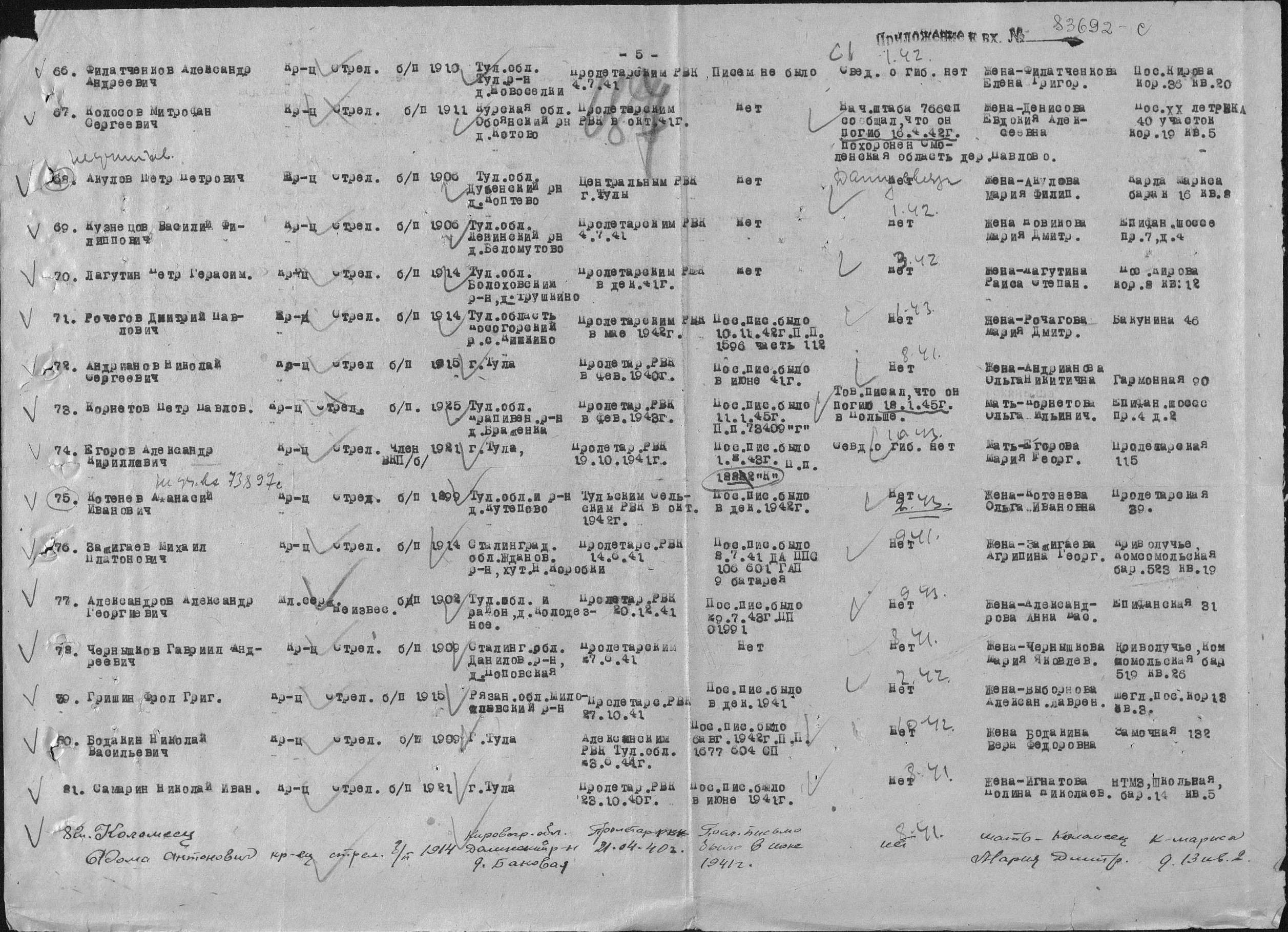 Куренков Виктор Иванович:Марухин Фома Сергеевич работал на заводе «Новая Тула» -№186, комбайновый, он жил г. Тула, пос. XX лет РККА, 40 участок. . Но извещение было направлено по адресу : ул. Софьи Перовской дом 5. А кто тогда жил по улице Софьи Перовской? С уважением, Валерий Попов |