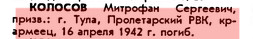 Валерий. Колосов М. С. погиб в составе 766 СП 217 СД.!! До этого он участвовал в обороне Тулы октябрь – декабрь 1941 г. в составе тульского рабочего полка. Колосова М.С. нет в донесении о безвозвратных потерях 766 СП 217 СД. Многие бойцы тульского рабочего полка так и не вошли в историю ТРП. |