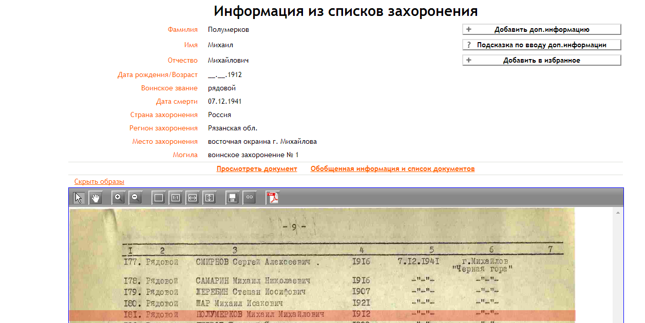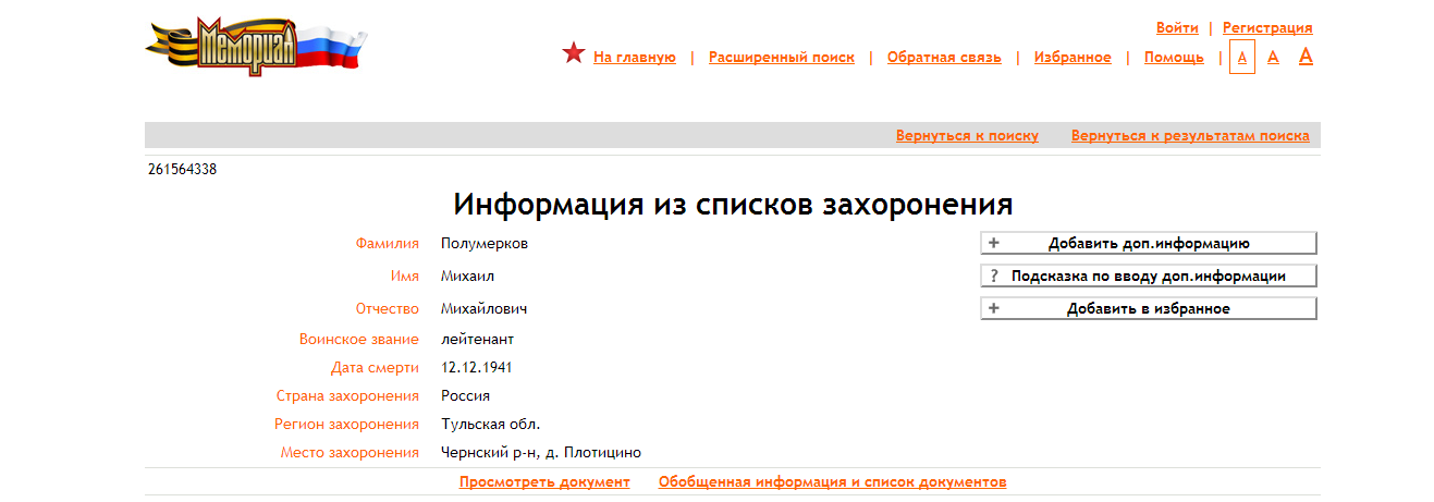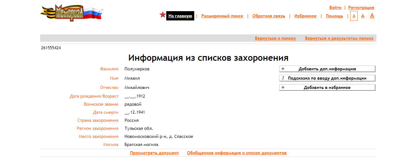 Мысль первая. Надо сказать и написать о том, что исследуя братскую могилу в Новомосковском районе, село Спасское я обнаружил множество людей которые видимо одновременно захоронены в Спасском и в деревне Михайловка, Рязанской области. В списке Спасского кладища ( и это до Полумеркова ) таких людей 34. Даже если часть из этих людей полные тёзки, то думаю, что надо надо начать наше исследование именно с этих двух могил. С уважением, Валерий Попов | ||||||||||