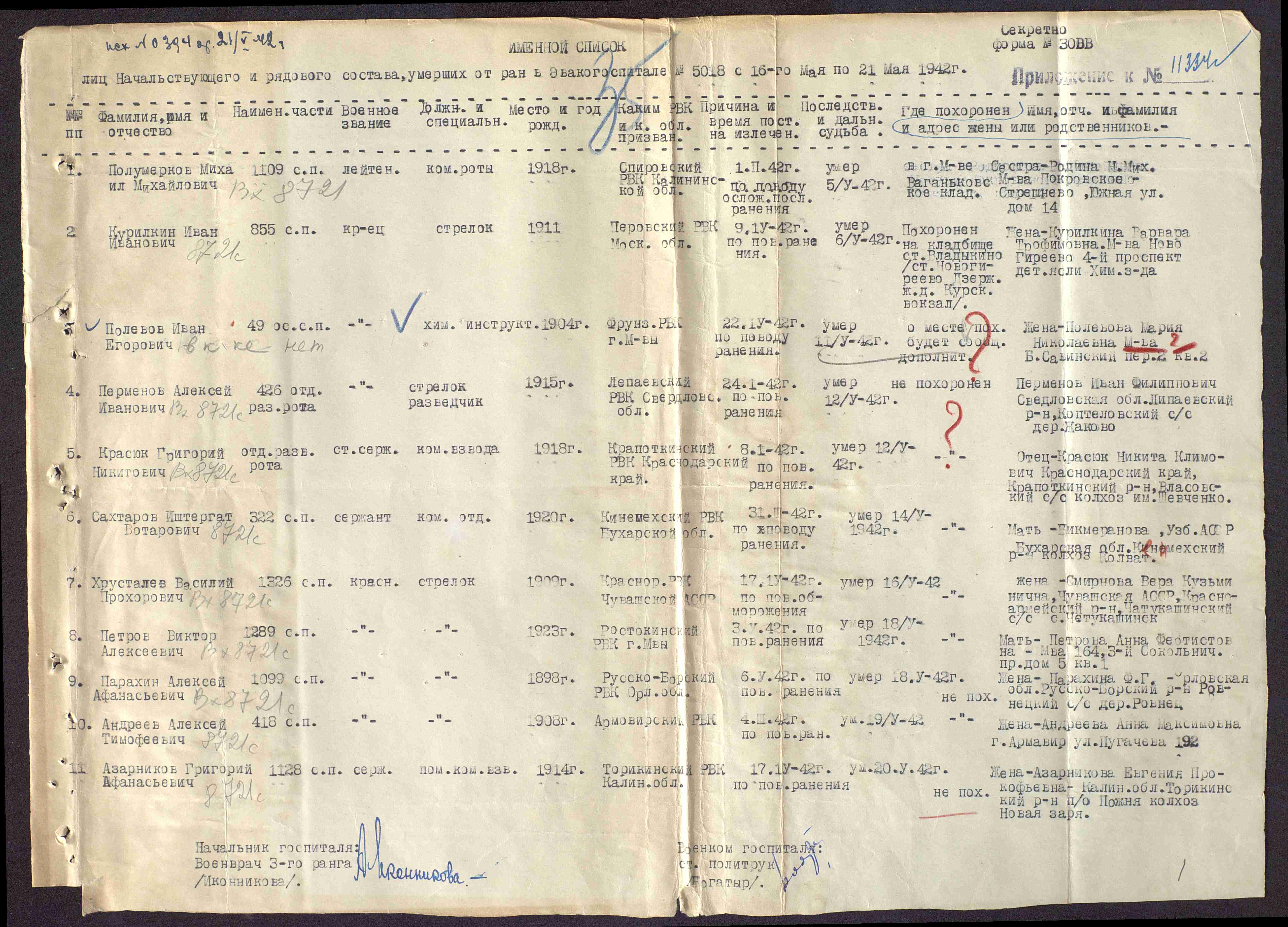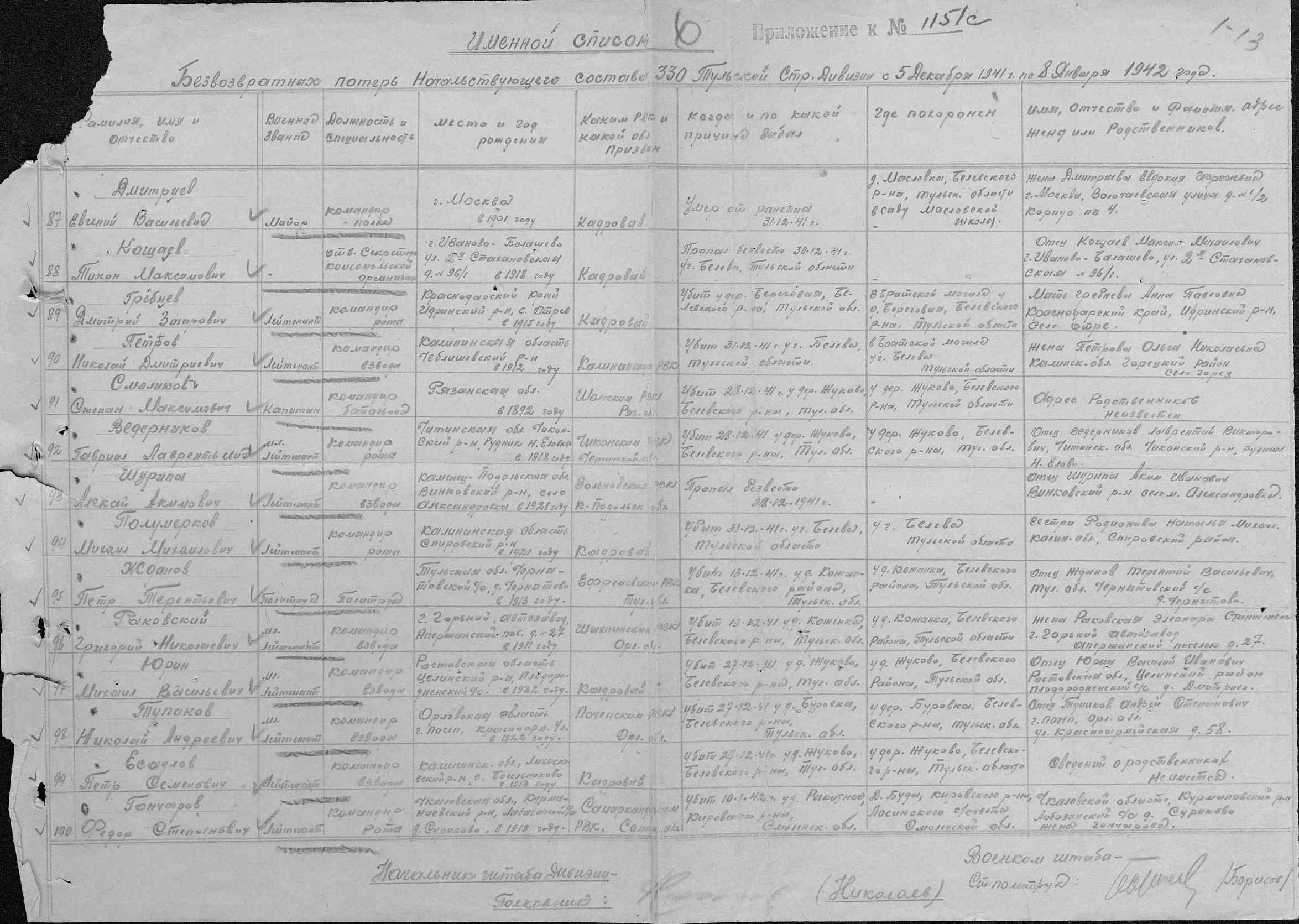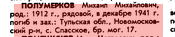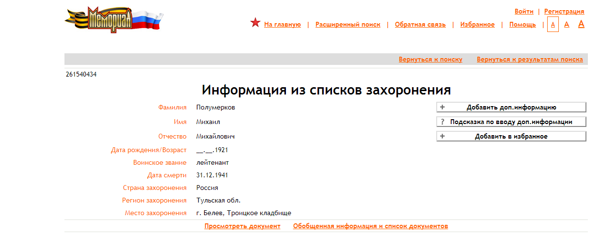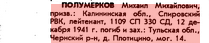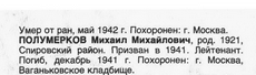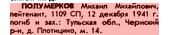 Вывод. Полумерков Михаил Михайлович в любом случае воевал в 1109 полку 330 СД на территории Тульской области. Не думаю, что за период времени ноябрь декабрь 1941 года включительно в конкретном полку было два полных тёзки родившихся к тому же в одном селе. Считаю, что это один человек. Похоронен он на Армяском участке Ваганьковского кладбища. В этом я согласен с Татьяной Вотинцевой. Как и Татьяна считаю, что тут нужно доверится госпитальному документу по которому он похоронен на Ваганьковском кладбище в Москве. Тему можно закрывать. Редактировалось: 1 раз (Последний: 21 августа 2014 в 16:06) С уважением, Валерий Попов |