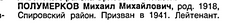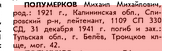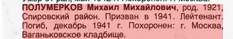 Подведем итоги. Полумерков Михаил Михайлович. Что разное. 1. Год рождения ( 1912, 1918, 1921 ). 2. Звание ( лейтенант, рядовой ). 3. Место захоронения ( Версии в первом посте ). 4. Дата смерти ( 7.12.1941, 12.12.1941, 31.12.1941 и 05.05.1942). Редактировалось: 2 раз (Последний: 21 августа 2014 в 15:51) С уважением, Валерий Попов | ||||||||||