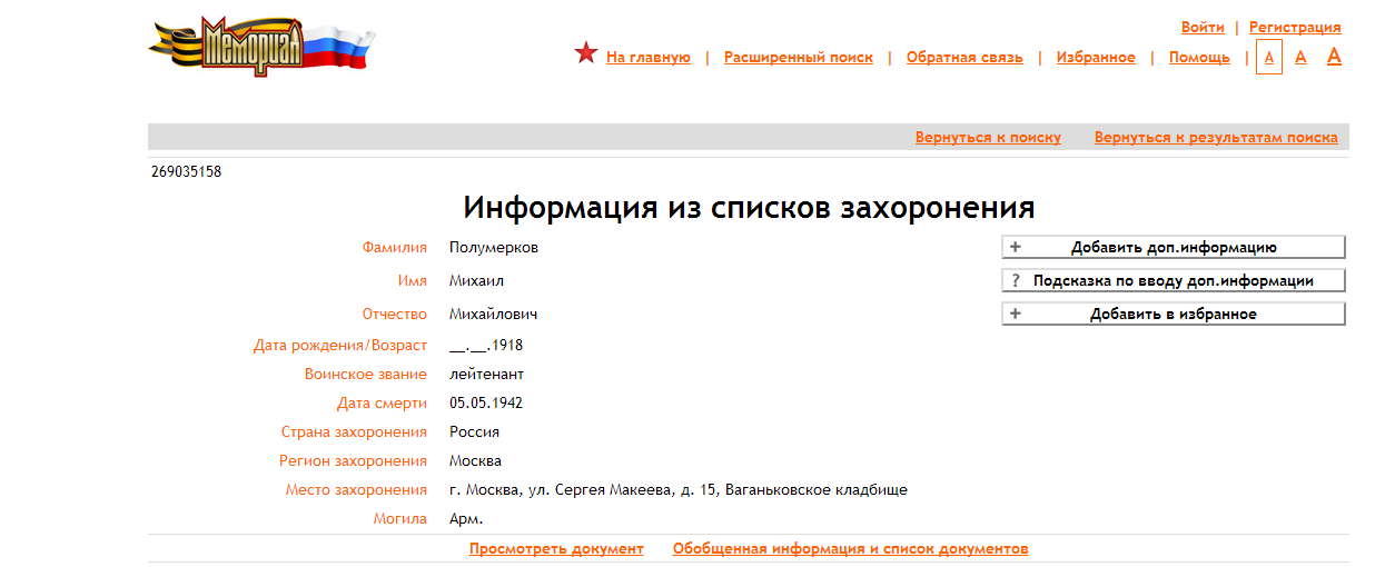 Информация из медицинского документа Фамилия Полумерков Имя Михаил Отчество Михайлович Последнее место службы 1109 СП Воинское звание лейтенант Причина выбытия умер от ран Дата выбытия 05.05.1942 Госпиталь 5018 ЭГ Название источника информации ЦАМО Номер фонда источника информации 58 Номер описи источника информации А-83627 Номер дела источника информации 7169 Захоронен на Ваганьковском кладбище. Прикрепленные файлы: