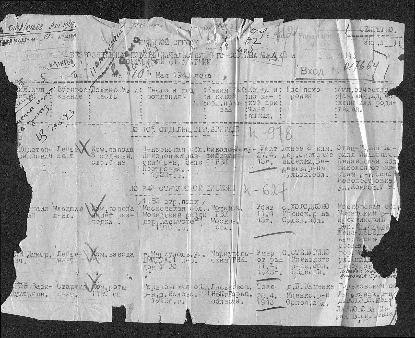 А вот тот документ, из которого, с одной стороны, взялась запись в книге памяти Пензенской области, а с другой - в книге памяти Калужской области: Информация из донесения о безвозвратных потерях Фамилия [неразборчиво] Имя Константин Отчество Кириллович Дата рождения/Возраст __.__.1923 Место рождения Пензенская обл., Никольско-Пестровский р-н, с. Пестровка Последнее место службы 61 Арм. 105 ОСБр. 3 ОСБ Воинское звание лейтенант Причина выбытия убит Дата выбытия 27.04.1943 Название источника информации ЦАМО Номер фонда источника информации 33 Номер описи источника информации 11458 Номер дела источника информации 162 Захоронен южнее 2 км. деревни Сметские Выселки Белевского района Тульской области. Прикрепленные файлы: