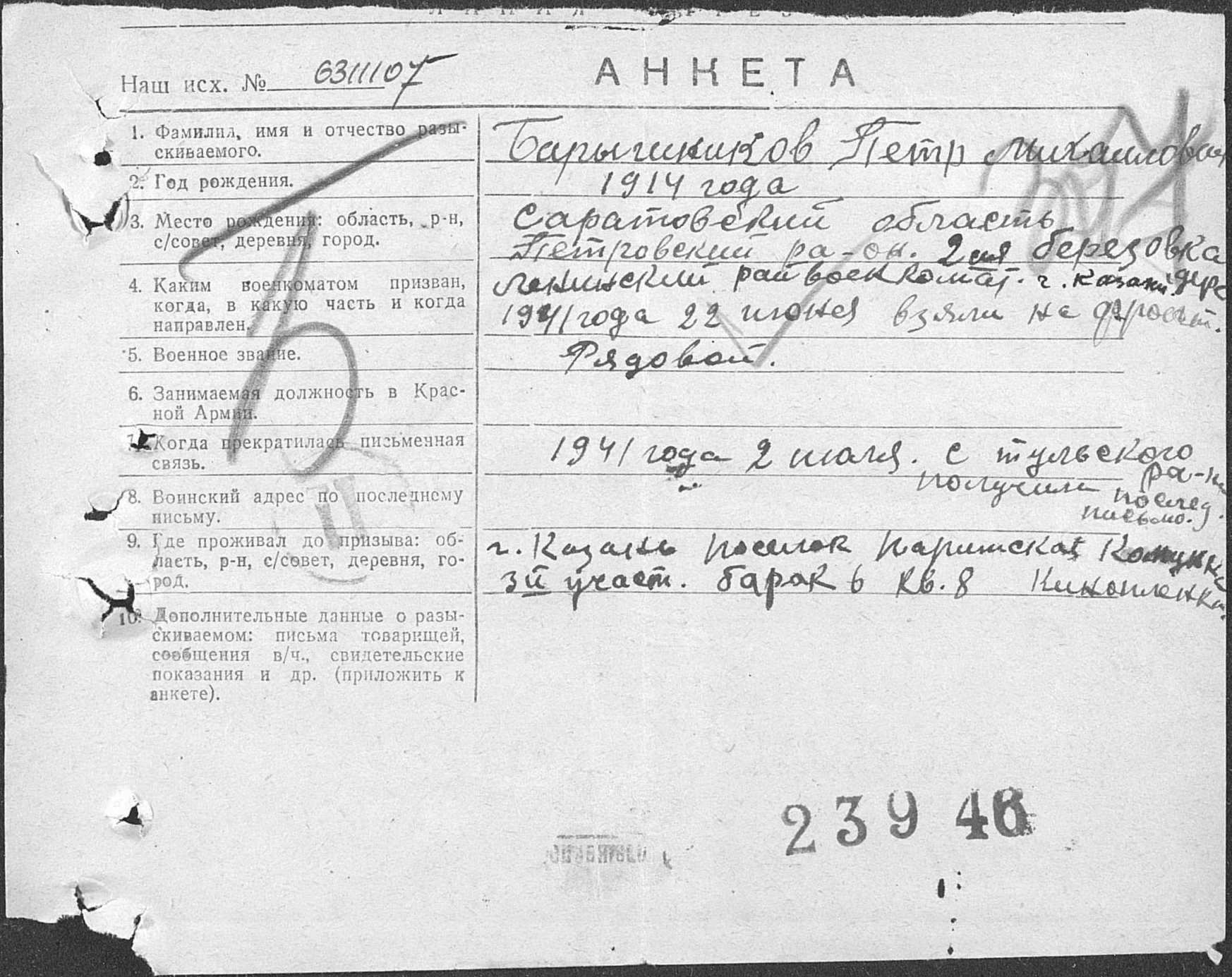 Информация из документов, уточняющих потери Фамилия Барышников Имя Петр Отчество Михайлович Дата рождения/Возраст __.__.1914 Место рождения Саратовская обл., Петровский р-н, д. 2 Березовка Дата и место призыва 22.06.1941 Ленинский РВК, г. Казань Воинское звание рядовой Причина выбытия пропал без вести Дата выбытия __.10.1941 Название источника информации ЦАМО Номер фонда источника информации 58 Номер описи источника информации 18004 Номер дела источника информации 2414 Последнее письмо датировано 2 июля 1941 года и было отправлено из Тульского района. Тульский район — административно-территориальная единица в составе Тульской губернии, Московской и Тульской областей РСФСР, существовавшая в 1924—1957 годах. Административный центр — Тула. Тульский район был образован в 1924 году в составе Тульского уезда Тульской губернии. 8 сентября того же года Тульский район был объединён с Басовским районом в Тульско-Басовский район. В 1926 году Тульский уезд был упразднён и район перешёл в прямое подчинение Тульской губернии. 12 июля 1929 года район вошёл в Тульский округ Московской области, при этом он был переименован Тульский. К началу 1930 года в состав район входили рабочий посёлок Косая Гора и сельсоветы Алексеевский, Алешинский, Архангельский, Барсуковский, Беломутовский, Берниковский, Больше-Еловский, Бушевский, Варфоломеевский, Волотинский, Волынцевский, Горельский, Горюшинский, Гремячевский, Дягилевский, Елькинский, Жировский, Зайцевский, Казановский, Кишкинский, Коптевский, Криволученский, Кутеповский, Луковицкий, Лутовиновский, Малевский, Масловский, Медведенский, Мерлиновский, Михалковский, Некрасовский, Новобасовский, Новоселковский, Обидимский, Петелинский, Поповкинский, Присадский, Ревякинский, Рождественский, Рудневский, Садковский, Севрюковский, Синетулицкий, Скуратовский, Слободский, Татьевский, Торховский, Труфановский, Хрущевский, Частинский, Чириковский, Якволевский и Ямно-Селезневский. После ликвидации округов в 1930 году район перешёл в прямое подчинение Московской области. 30 июня 1931 года из Щёкинского района в Тульский были переданы Должанский, Панинский, Плехановский, Подосиновский и Смирновский с/с, а из Оболенского района — Алешковский, Белолипецкий, Гамовский, Грецовский, Дедиловский, Демьяновский, Дубковский и Киреевский с/с. 20 сентября 1932 года в новый Дедиловский район были переданы Дедиловский, Должанский, Киреевский, Панинский, Плехановский, Подосиновский и Смирновский с/с. 7 января 1934 года был образован р.п. Новотульский[1]. 26 сентября 1937 года Тульский район был отнесён к Тульской области. 21 августа 1939 года из части Тульского района был образован Ленинский район. 15 февраля 1944 года из части Тульского района был образован Косогорский район. 13 декабря 1957 года Тульский район был упразднён, а его территория разделена между Болоховским и Лаптевским районами. Редактировалось: 1 раз (Последний: 15 апреля 2015 в 15:51) | ||