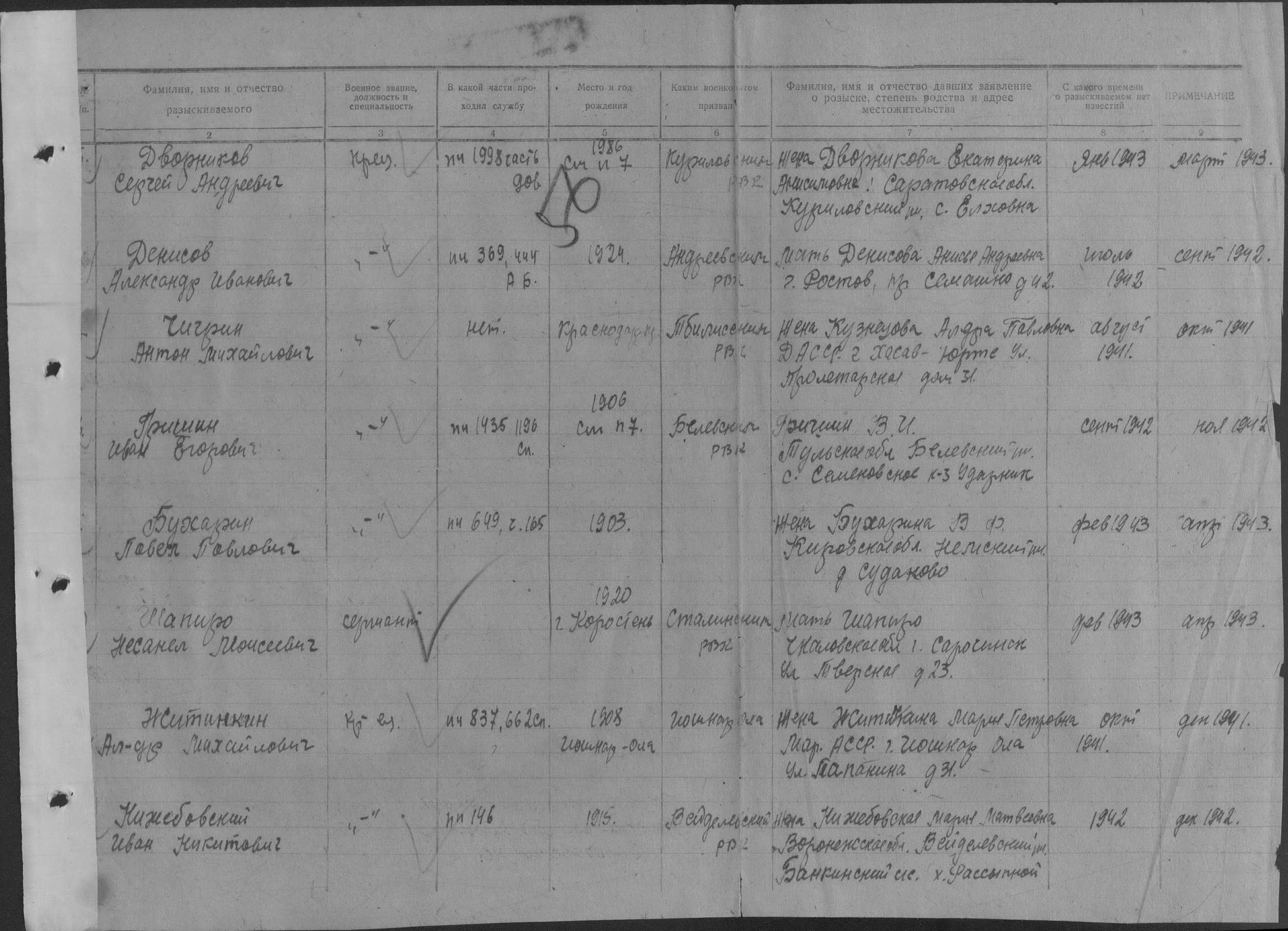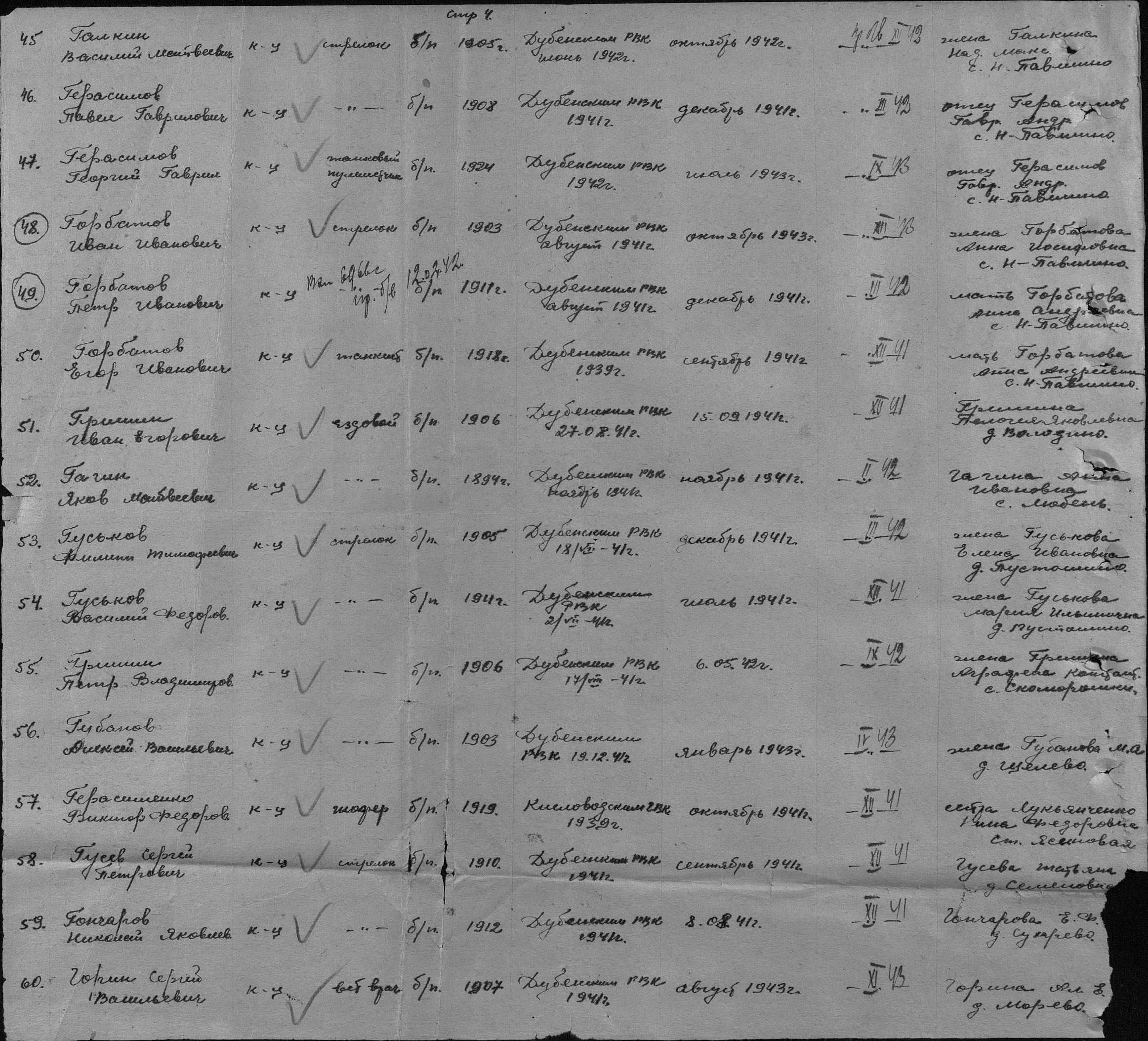 Елена в обд, если прокрутить немного ниже этой информации будет сам документ и там указано, что Гришин И.Е. призывался из Белевского района, если есть желание, можете посмотреть так тех, кто призывался из Дубенского района, место, где указывается фамилия оставить пустым, а заполнить только место рождения и место призыва. | ||||