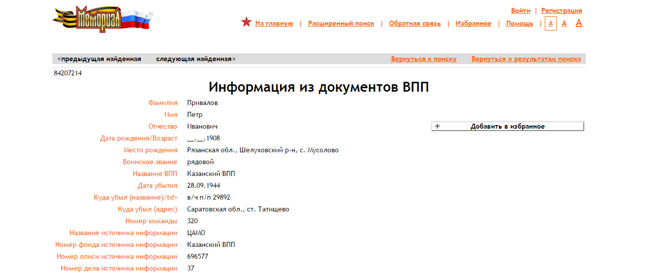 Место рождения Привалова Петра Ивановича Рязанская область Михайловский район село Новопанское. У него на тот момент было трое детей и жена, о том что родился 4 ребенок он и не знает. И нашла информацию из документа. Информация из документов, уточняющих потери Фамилия Привалов Имя Петр Отчество Иванович Дата рождения/Возраст __.__.1908 Место рождения Рязанская обл., Михайловский р-н, Новопанский с/с Дата и место призыва 30.06.1941 Михайловский РВК, Рязанская обл., Михайловский р-н Воинское звание красноармеец Причина выбытия пропал без вести Дата выбытия __.11.1941 Название источника информации ЦАМО Номер фонда источника информации 58 Номер описи источника информации 18004 Номер дела источника информации 602 Редактировалось: 2 раз (Последний: 24 апреля 2015 в 18:04) | ||||