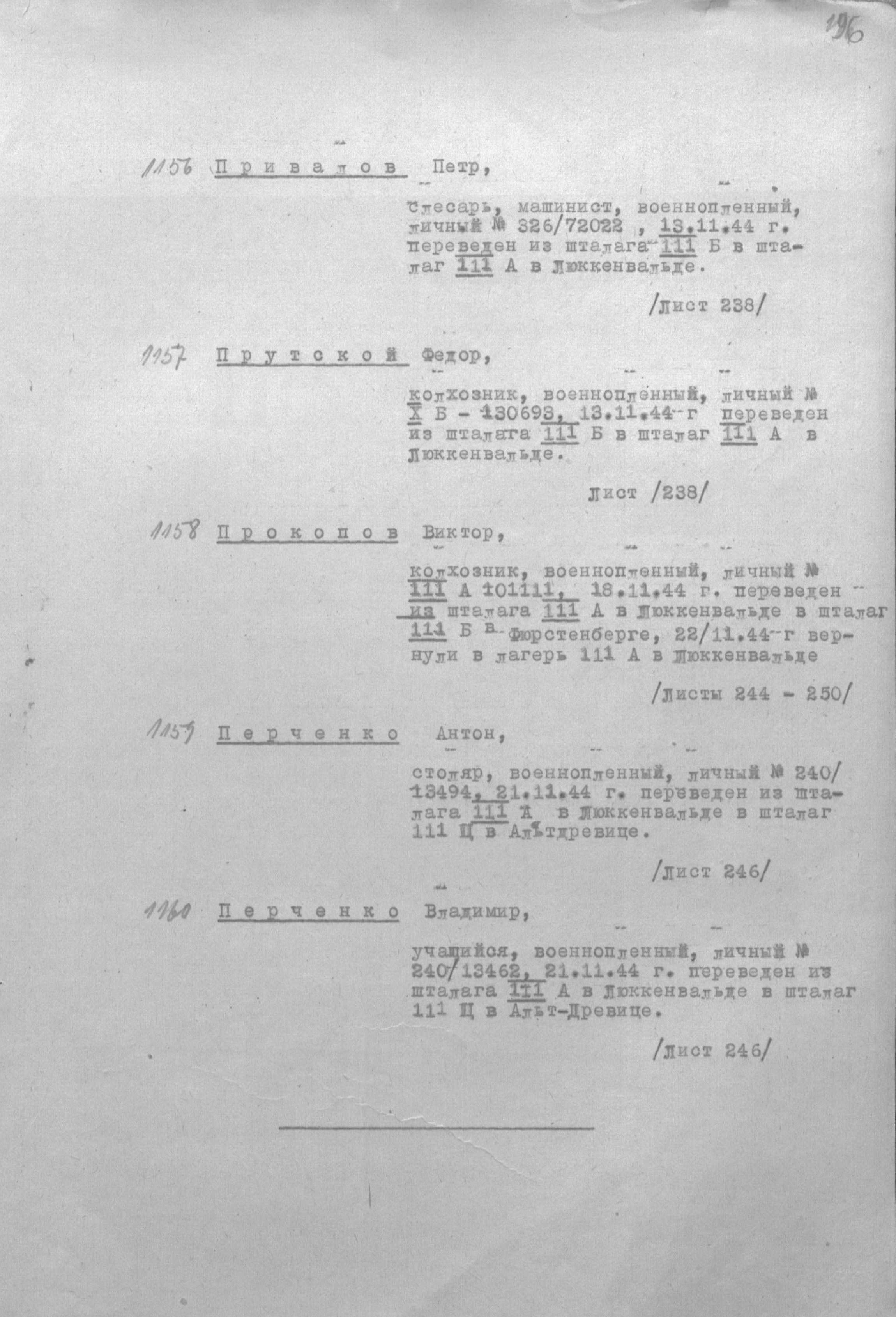 Есть такой документ: Информация о военнопленном Фамилия Привалов Имя Петр Отчество Лагерный номер 72022 Лагерь шталаг III A Судьба попал в плен Название источника информации ГАРФ Номер фонда источника информации р-7021 Номер описи источника информации 115 Номер дела источника информации 30 Прикрепленные файлы: