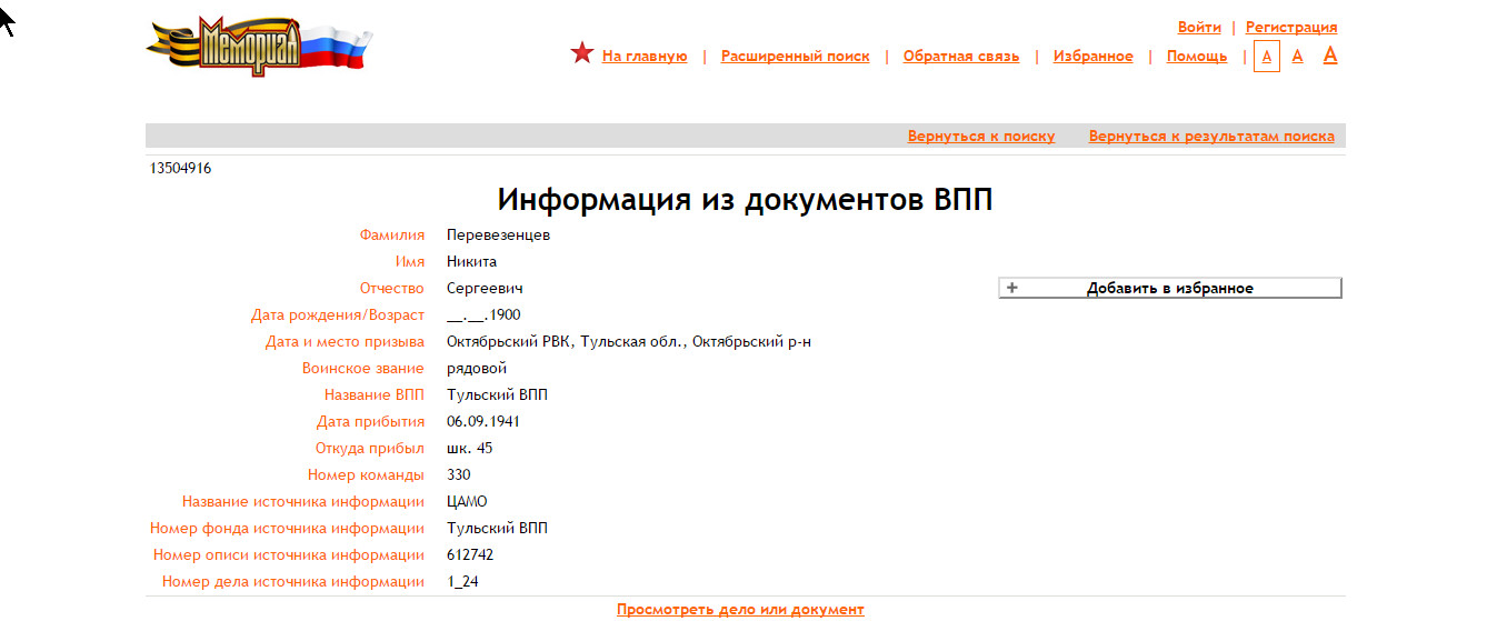 Информация из документов, уточняющих потери Фамилия Первезенцев Имя Никита Отчество Сергеевич Дата рождения/Возраст __.__.1900 Дата и место призыва 27.06.1941 Октябрьский РВК, Тульская обл., Октябрьский р-н Последнее место службы 1109 полк Воинское звание красноармеец Причина выбытия пропал без вести Дата выбытия __.03.1942 Название источника информации ЦАМО Номер фонда источника информации 58 Номер описи источника информации 977520 Номер дела источника информации 189 330 стрелковая дивизия Подчинение: 01.03.1943 года Западный фронт 10-я армия По донесениям 330 с.д. несла потери в этот период в Кировском районе Смоленской области. Ржевско-Вяземская операция. Редактировалось: 3 раз (Последний: 5 мая 2015 в 20:48) | ||||