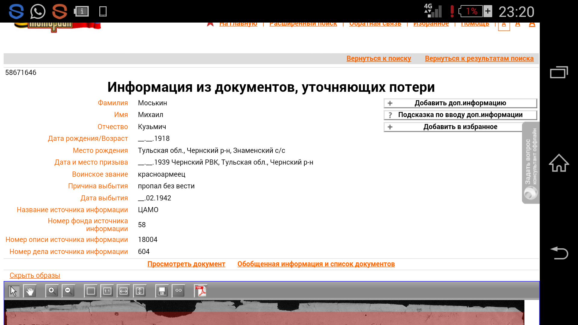 Уважаемая Ольга Юрьевна! По поводу даты рождения Михаила Кузьмича: думаю, что все же 1918 год. Посмотрите внимательно, в донесении https://www.obd-memorial.ru/html/info.htm?id=58671537&page=10 в графе "дата рождения" последняя цифра пропечатана не очень разборчиво, можно принять как за 3, так и за 8. Но далее, в графе "дата призыва" тройка пропечатана явно и на всех остальных страницах этого документа. В понедельник я позвоню в военкомат Чернского и Плавского р-нов Валерию Анатольевичу по этому вопросу. По алфавитной книге призыва и, возможно, можно будет уточнить и год рождения. В Книге Памяти Тульской обл. Михаил Кузьмич увековечен: МОСЬКИН Михаил Кузьмич, pод.: 1913 г., Тульская обл., Чернский р-н,д. Темное, русский, пpизв.: 24 июня 1941 г., Тульская обл., Чернский РВК, рядовой, в февpале 1942 г. пропал б/в. | ||||