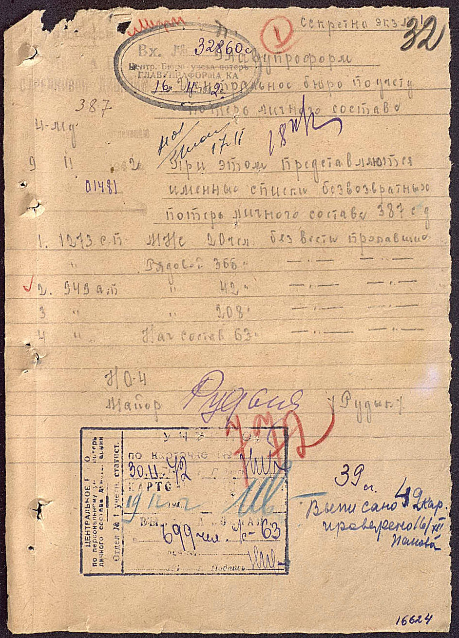 Из боевого пути 387 СД: http://forum.patriotcenter.ru/index.php?topic=3607.0 ...387 сд по приказу командира 387 сд полковника Кулижского, согласно приказа генерал Трубникова к 4.00 14.8 на оборонительном рубеже: Вяльцево - Никитская удалось вывести 2-3/1275 сп, специальные части дивизии (заградбатальон, учебный батальон, химрота) и все тыловые части. 1/1275 сп к 4.00 был в движении к Митровка. Остатки 1273 сп - прикрываясь со стороны Старица на восточной окраине Медынцево. Одна стрелковая рота и истребительно-противотанковый дивизион на безымянной высоте ю-з Пустой ? 5-я рота. Остальные части 1273 сп были выведены. Командир дивизии с прокурором дивизии, начальник особого отдела, начальник политотдела выехали с КП в 4.00, оставив на КП начальника штаба. В 4.40 при подъезде к Вяльцево, штаб был встречен огнем танков противника, отрезав путь на новый рубеж, в силу чего повернули обратно в х. Пустой, где встретили огонь 15 танков противника, двигавшихся из Холмищи на Медынцево. В Пустой скопилось до 300 подвод обозов трех дивизий, которые бросились в овраг между Медынцево и Пустой, где и были частью расстреляны, частью взяты в плен. Установить порядок не удалось. Часть командиров дивизии была схвачена и расстреляна на месте: комиссар штаба батальонный комиссар Кириченко, НШ майор Комаровский, прокурор Холодов. Полковник Кулижский до темноты просидев в кустах, начал выходить из окружения и вышел к 4.00 22.8 на участке 3 тк". Если предположить, что Ваш родственник погиб и захоронен в д. Медынцево (такая версия имеет место быть), то вот эта могила: "могила расположена в центре села. Имеется покрытый дерном могильный холм и за ним памятник. На кирпичном фундаменте сооружен кирпичный прямоугольный постамент, на котором установлена двухметровая скульптура воина в плащ-накидке с каской в левой руке. На постаменте имеется надпись: «Вечная память героям». Мемориальные доски отсутствуют. Могила обнесена металлической оградой." Прикрепленные файлы: