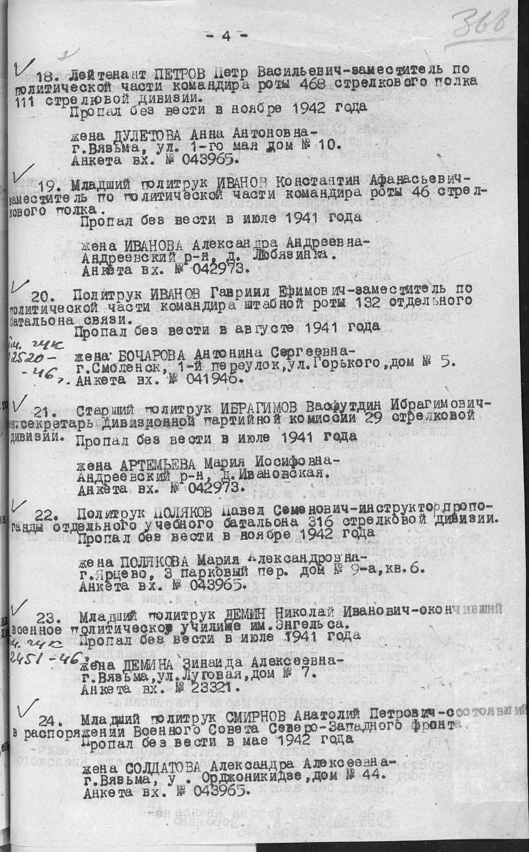 Спасибо, я пересмотрела все документы по перемещению 111 СД. Документы смотрела и по 468 СП и по дивизии и армии. Если брать в расчет, что о потерях сообщали в интервале 15 дней , а иногда 3 месяцев, смотрела передвижение СД с августа 1942г. В августе и сентябре 1942 468сп ведет бои в Тверской области ( д. Мурылево, Дураково, Мартюково, Добрая, Ханино, ) В октябре 111 СД после потерь переводят в резерв дальше по журналам и документы они находятся в районе г. Белева. Если отследить по дням, в документах пишется СД положения не меняет . Есть документ от 11/11/1942 в котором говорится , что с 1-10/11/42 потерь нет . Поэтому мне не понятно, либо он фактически пропал без вести в августе во время боев в Тверской области, а сообщили позже, либо в ноябре ( но боев нет, пишут, что дивизия проходит обучение, ждет пополнение и т. д). Может быть какая то бытовая ситуация. Бабушка получала пенсию за него. Вряд ли какое- то ЧП было. В военкомате , через который он призывался сказали никакой информации нет , все сгорело , так как Вязьма была в оккупации. В июне пойду в пенсионный фонд, поднимать дело о начислении пенсии (наверняка какая то бумажка есть в деле), а в июле поеду сама в ЦАМО, надеюсь личное дело сохранилось. | ||||