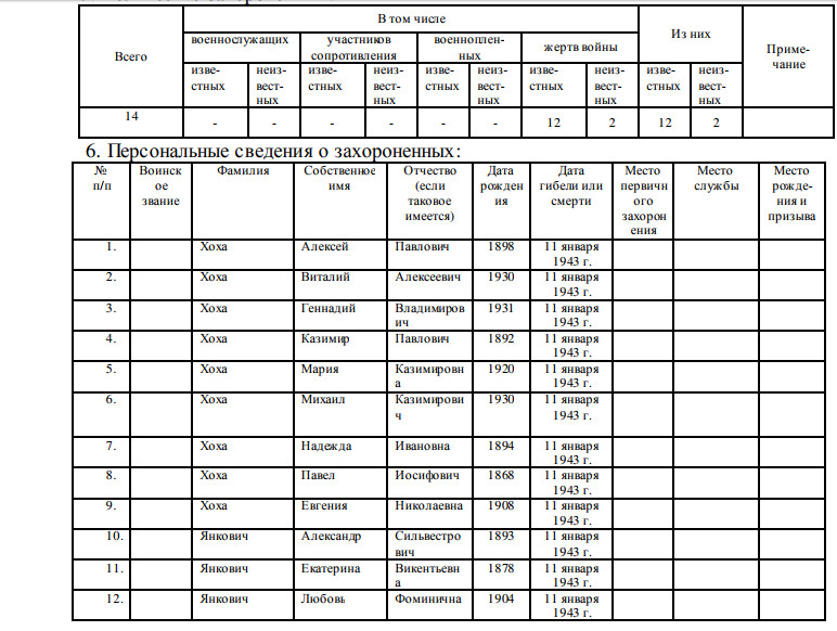 Роза Лекомцева: Здравствуйте! Для успешного поиска захоронения хорошо бы иметь информацию о сестре- возраст, была ли тоже узницей концлагеря Озаричи, дату гибели, обстоятельства гибели ... В заголовке темы, наверное, опечатка - отчество записано - Ивановна? Думаю, дополнительной информации не будет. Настя прекрасно знает, что она (информация) не помешала бы. Потому и имеем здесь то, что имеем... | ||||