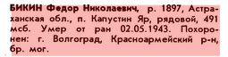 Что мы имеем. Адрес 968 ППС. Обратившись в ОБД "Мемориал" я выяснил, что Бикин Федор Николаевич, последним адресом которого была именно 968 ппс родился в Астраханской области, Капустинярском районе. Прилагаю скан. Имеется также Книга памяти о том, что он похоронен в Братской Могиле Красноармейского района, города Волгограда. ![]() ![]() С уважением, Валерий Попов | ||