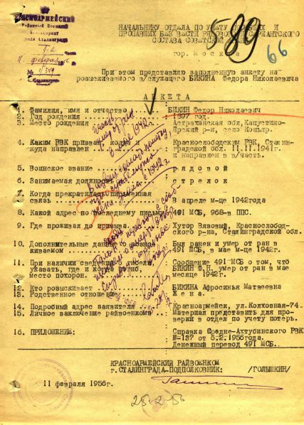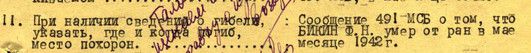 Бикина Федора Николаевича нет в донесениях о безвозвратных потерях, в документах госпиталей и медсанбатов. Есть документ, уточняющий потери от 1956 г. - анкета районного военкомата по месту призыва. Есть две записи в книгах памяти двух областей. Но им доверять нельзя, т.к. не могли похоронить по месту жительства. Анкета заполнялась со слов жены. Поэтому месяц, когда он умер от ран, мог быть указан неточно У внука Полякова Георгия Петровича хранится корешок денежного перевода, где есть следующие записи: «№ 245 03. От кого – финчасть МСБ 491, адрес 968-я ппс» Оттиск штемпеля: 20642, полевая почта (неразборчиво) Другая сторона: «об – 249-95, п/сб – 4-92, всего 245-03 Деньги раненого в боях и умершего от ран Бикина Федора Николаевича. Подпись – казначей МСБ» Нужен скан этого документа. | ||